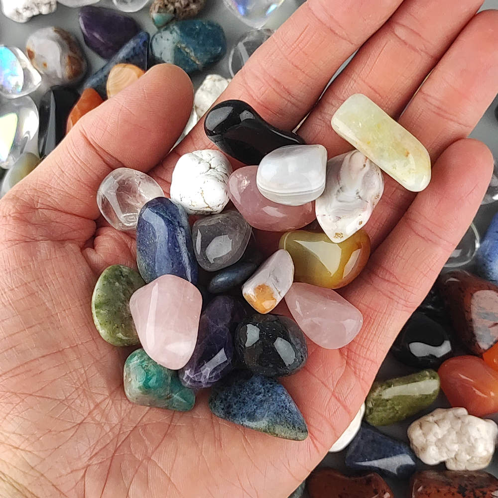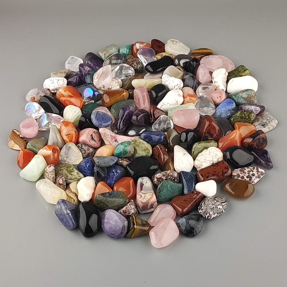 Zmes rôznych opracovaných (tromlovaných) kameňov veľkosť cca 1,5-2,5cm. Hmotnosť balenia cca 1kg. Na obrázku je odfotené cca množstvo 1kg. Vhodné ako dekorácia, alebo na ďalšie spracovanie.