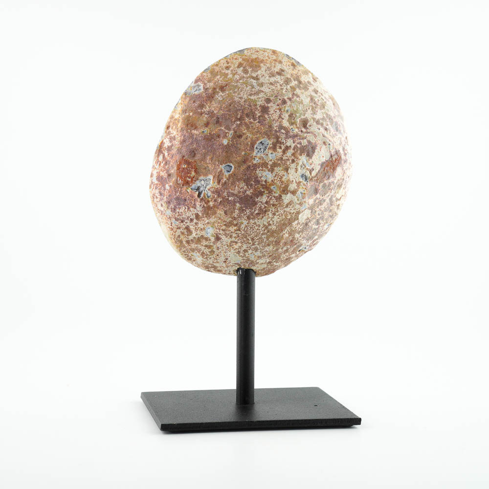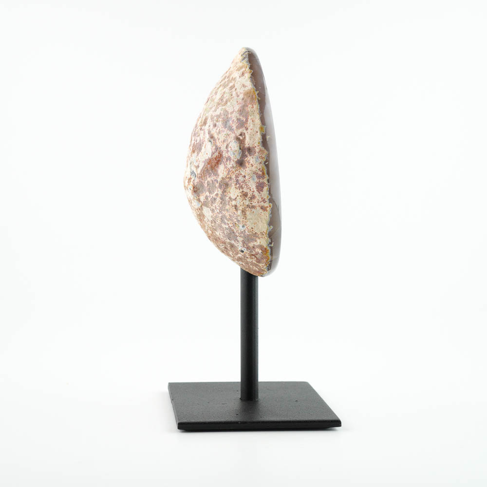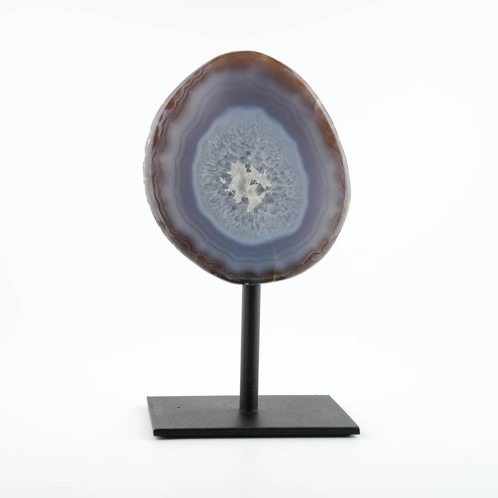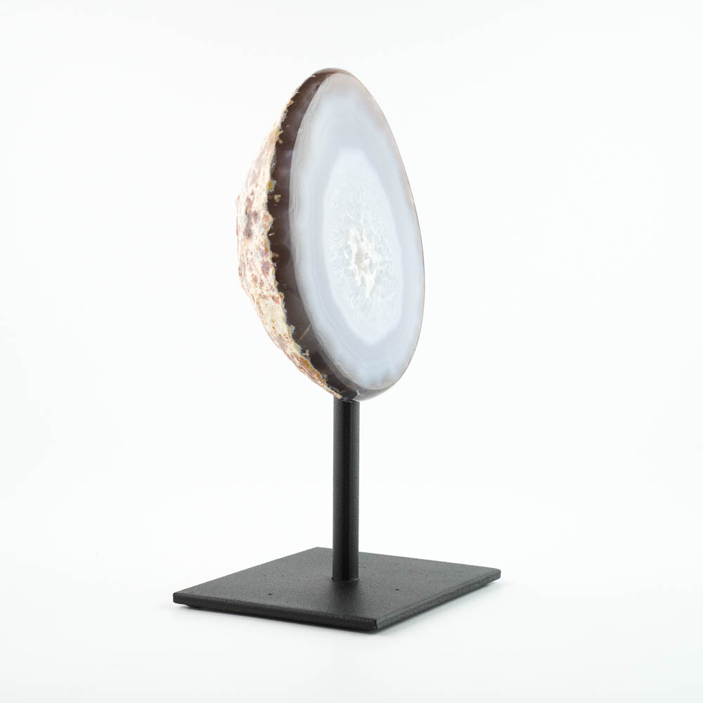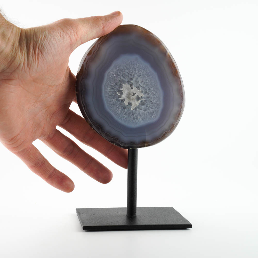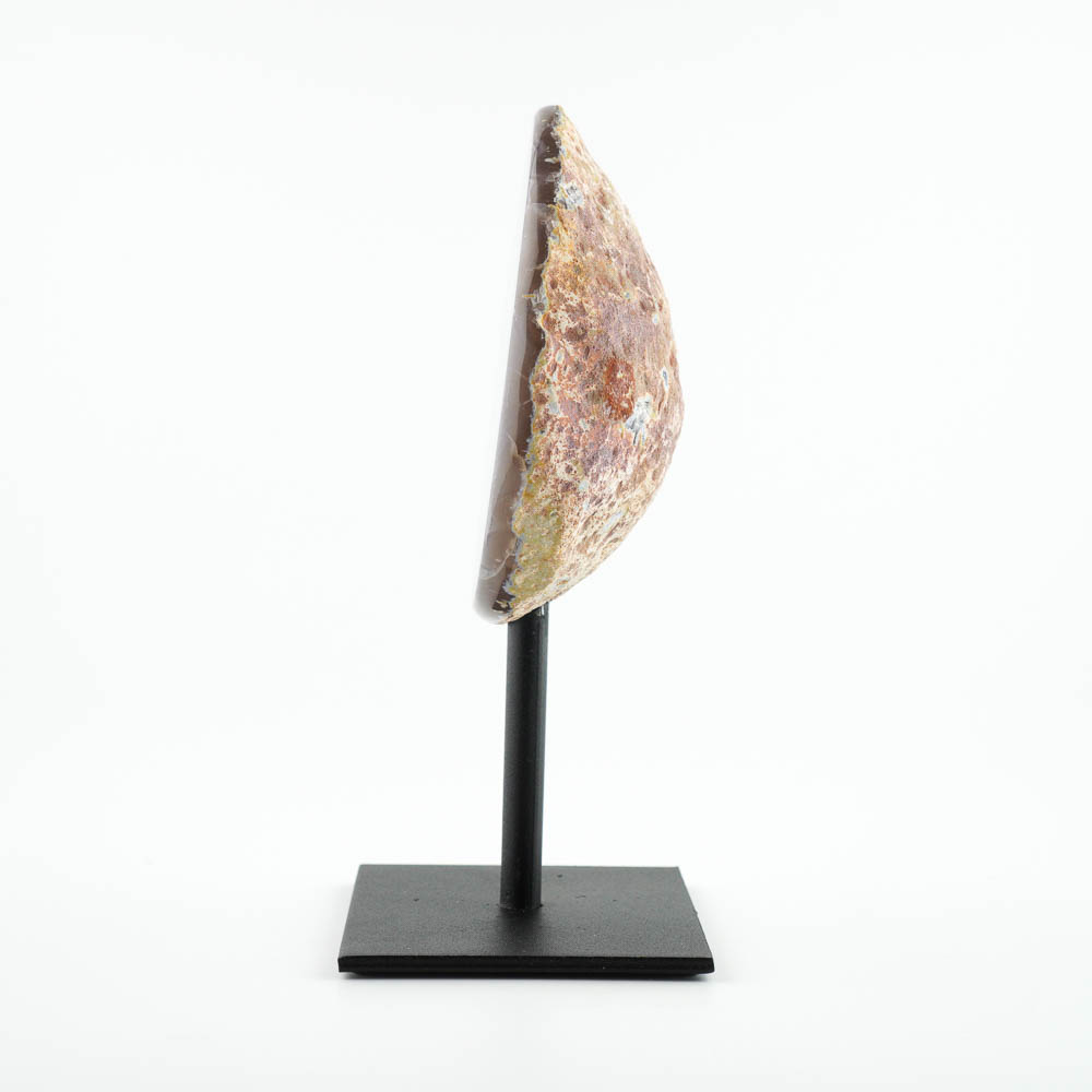 Krásny achát na pevnom kovovom podstavci z Brazílie. Veľkosť samotného kameňa cca 10,5x12x4cm, celková výška aj s podstavcom cca 19cm. Hmotnosť cca 933g