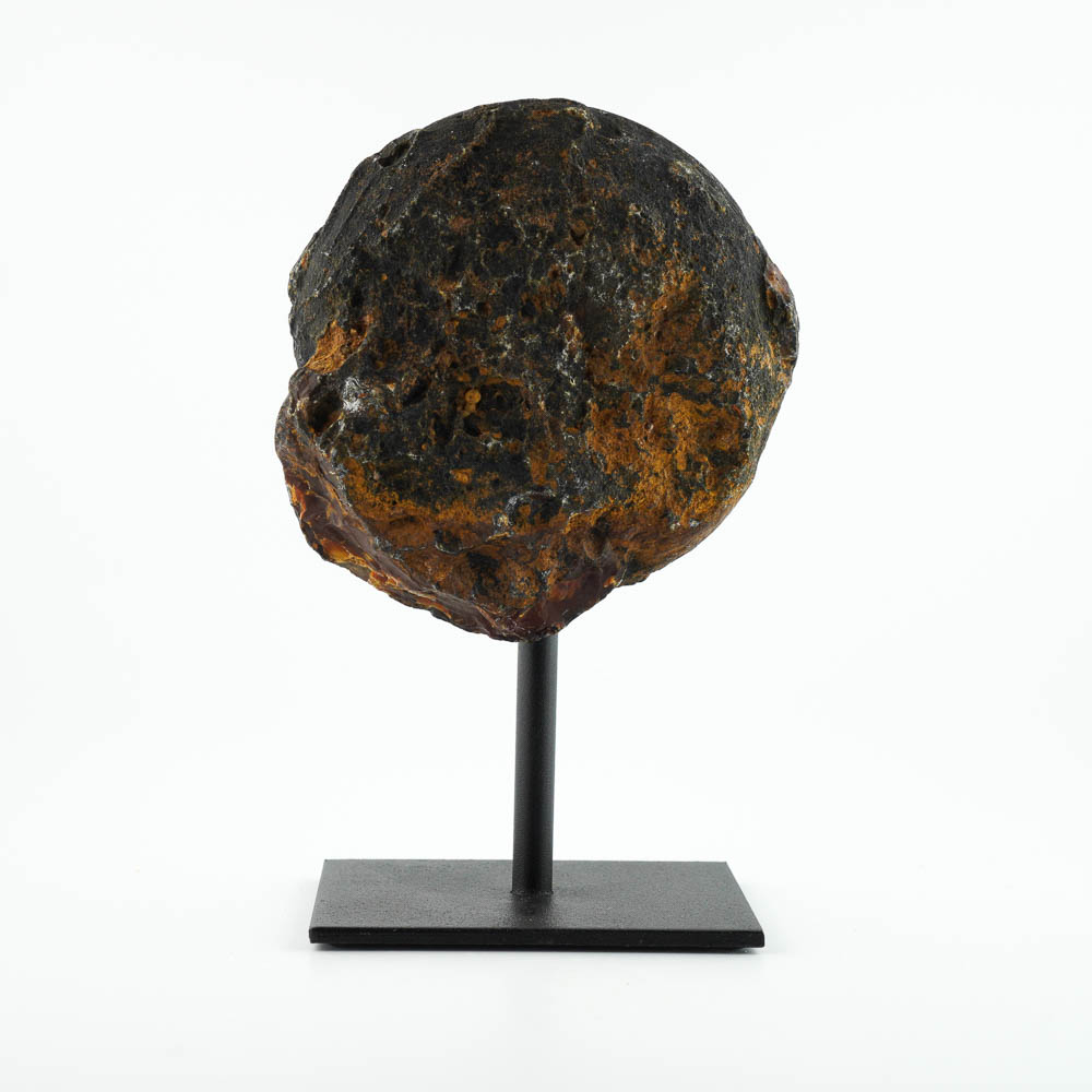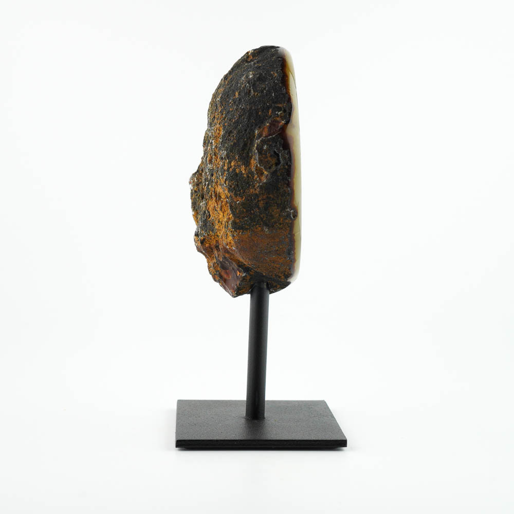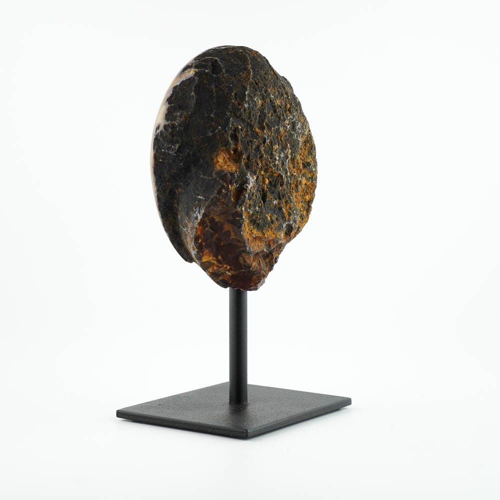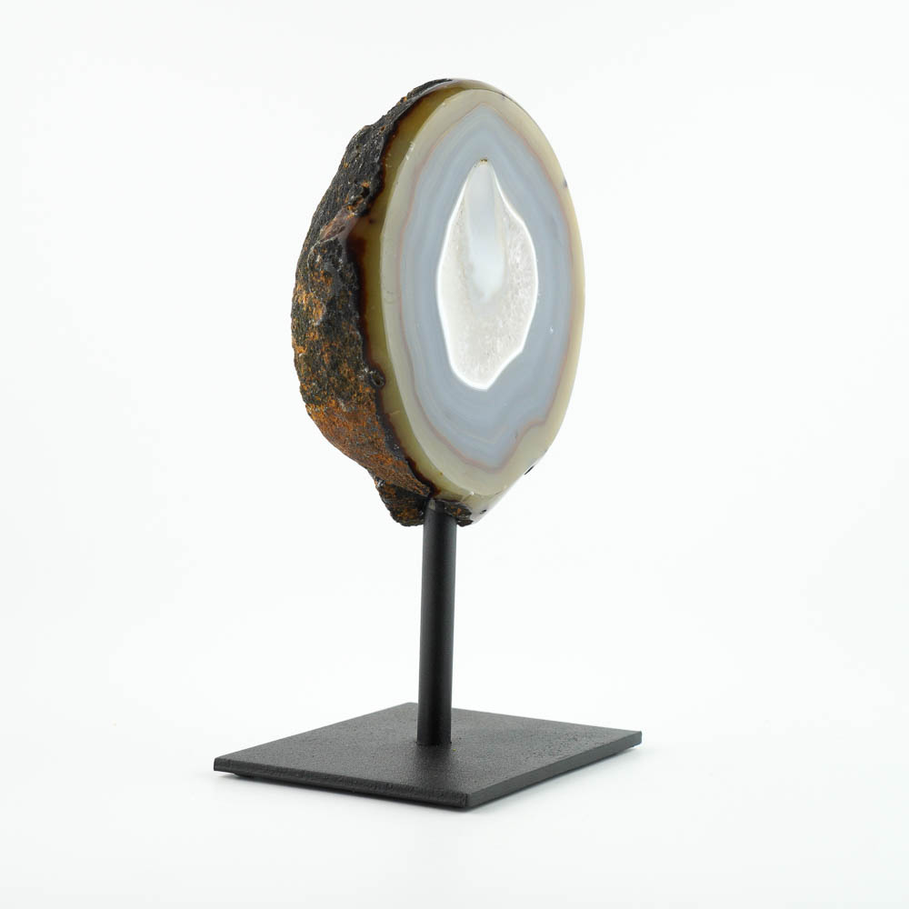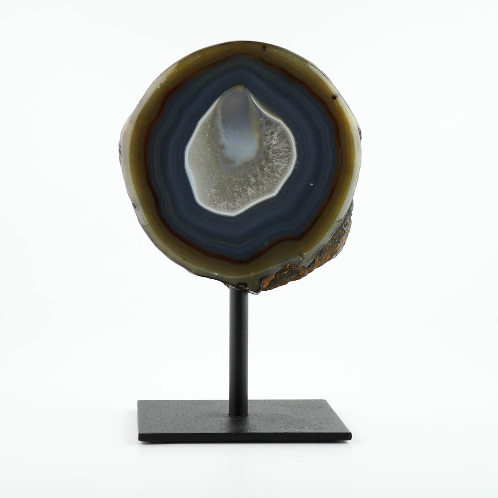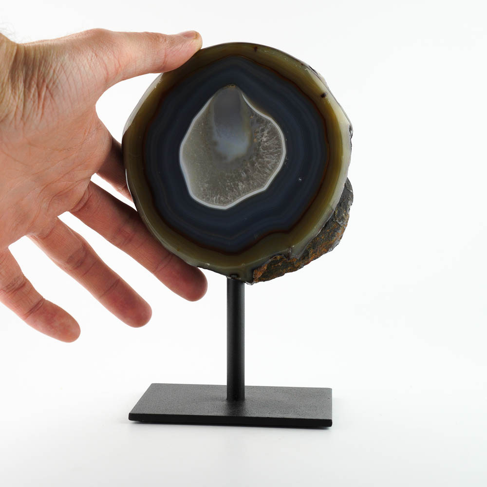 Krásny achát na pevnom kovovom podstavci z Brazílie. Veľkosť samotného kameňa cca 12x12x5cm, celková výška aj s podstavcom cca 19cm. Hmotnosť cca 1,32kg