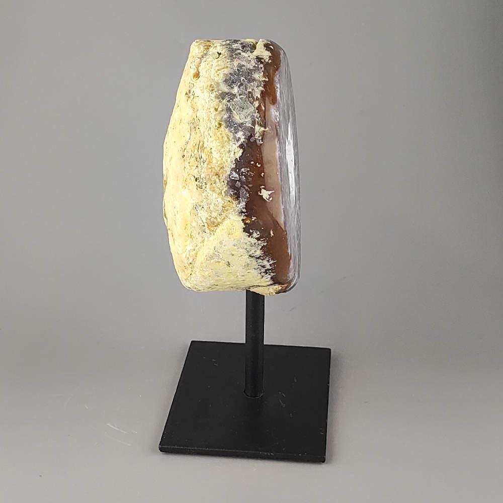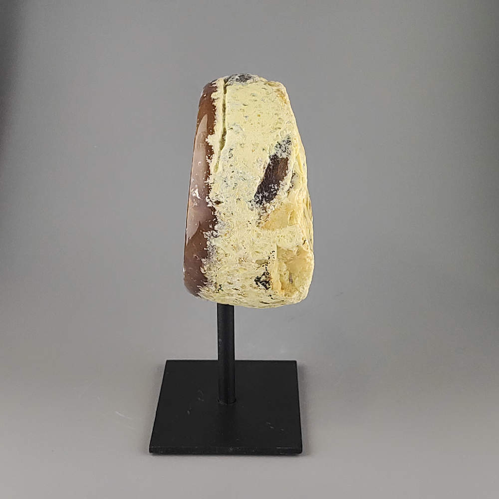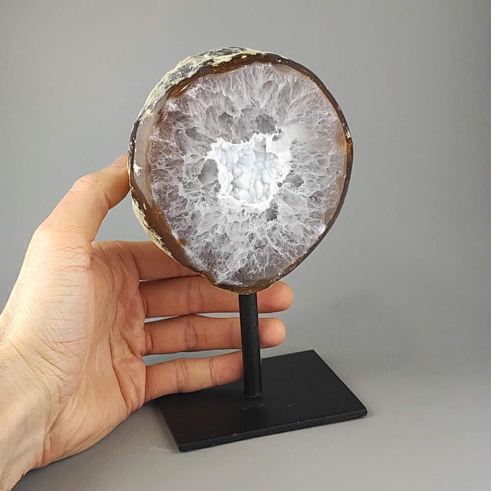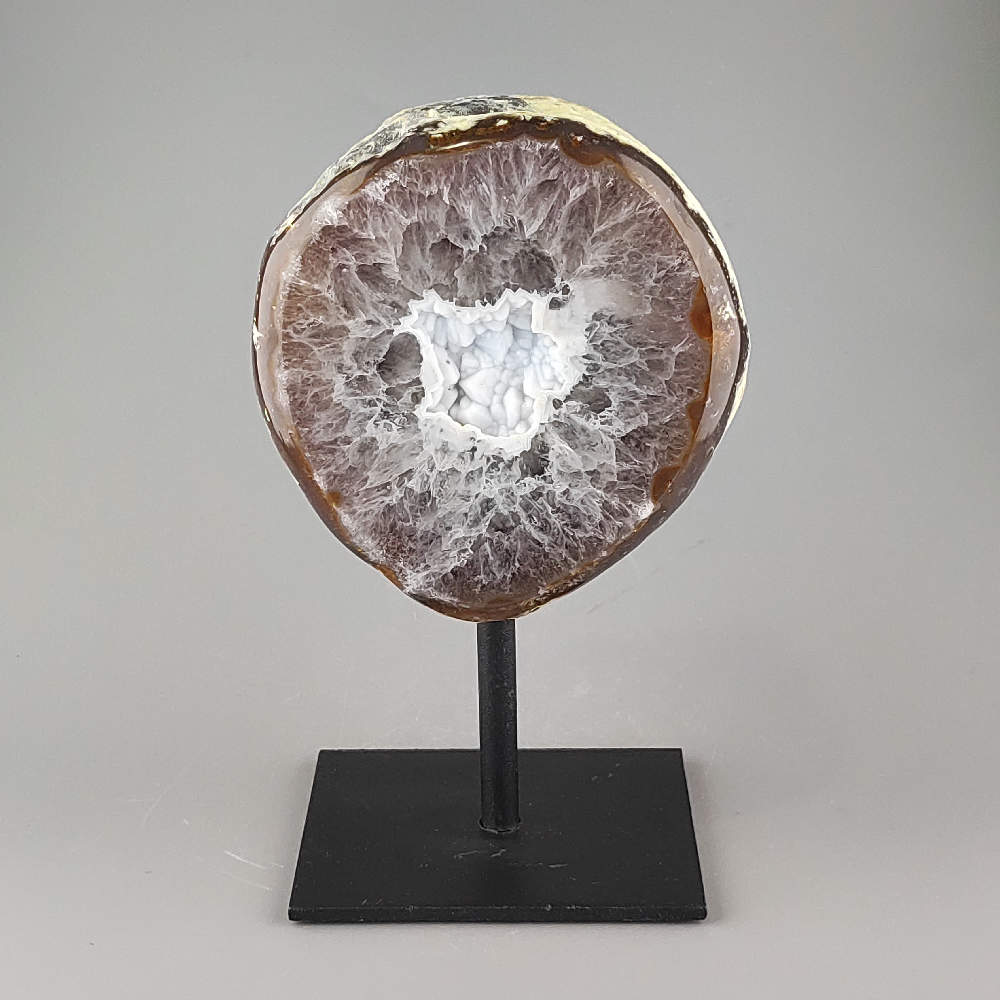 Krásny achát na pevnom kovovom podstavci z Brazílie. Uvedená veľkosť je vrátane kovového podstavca