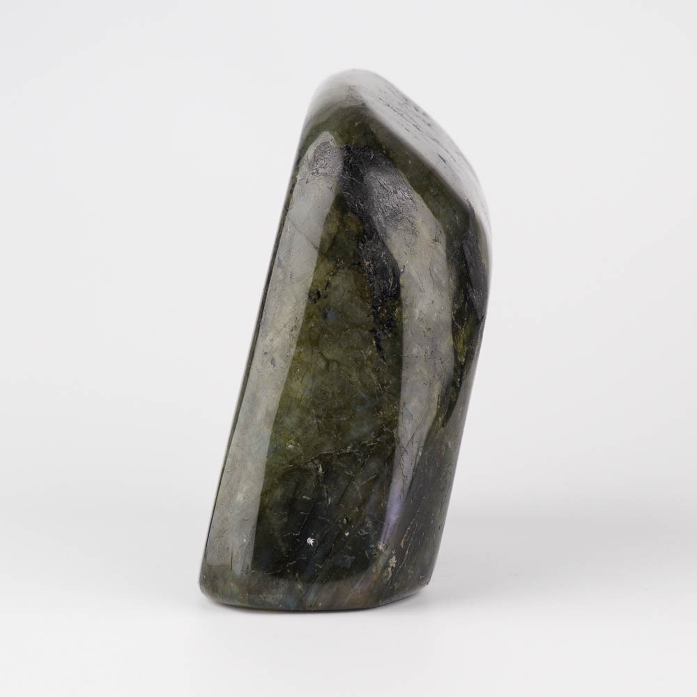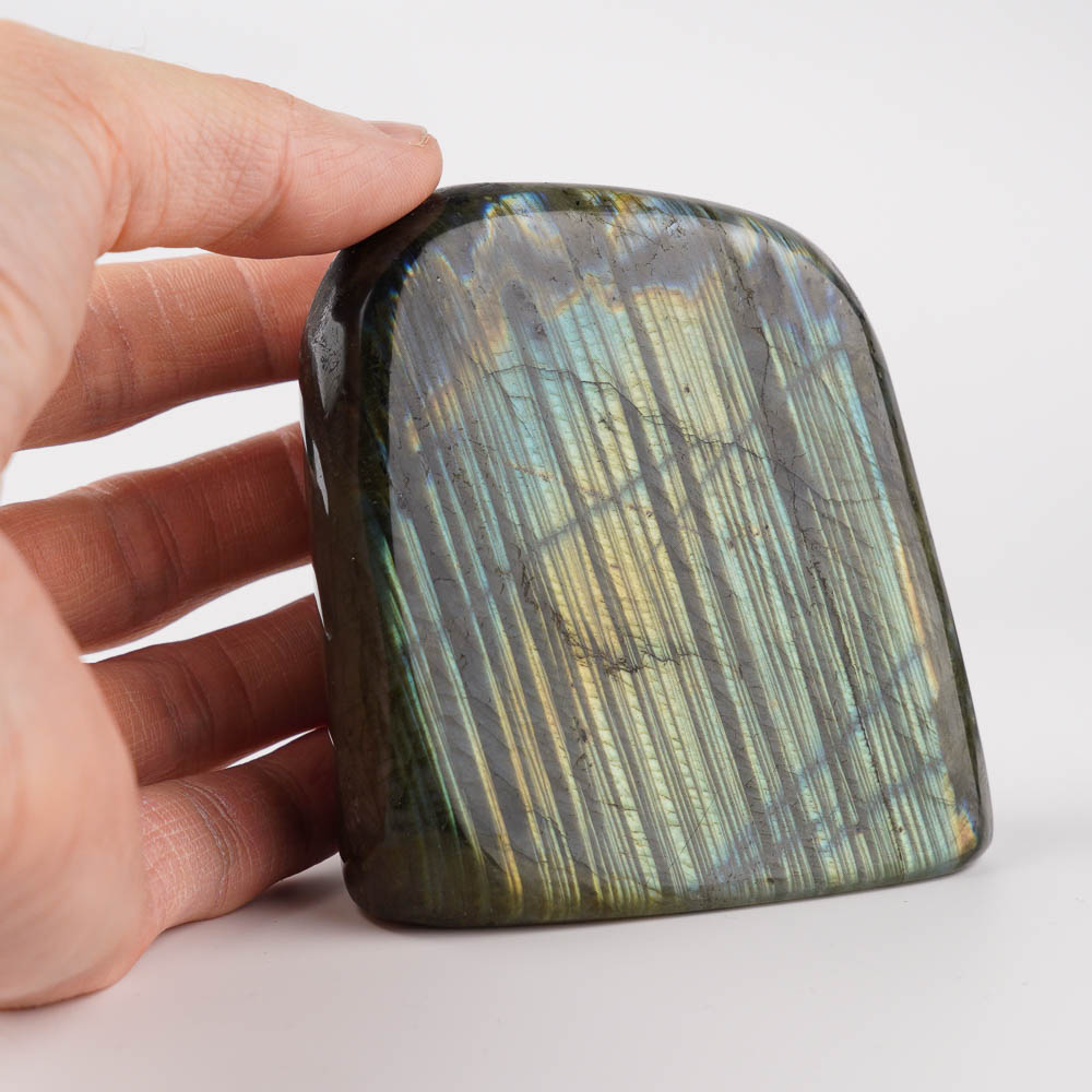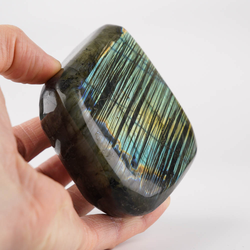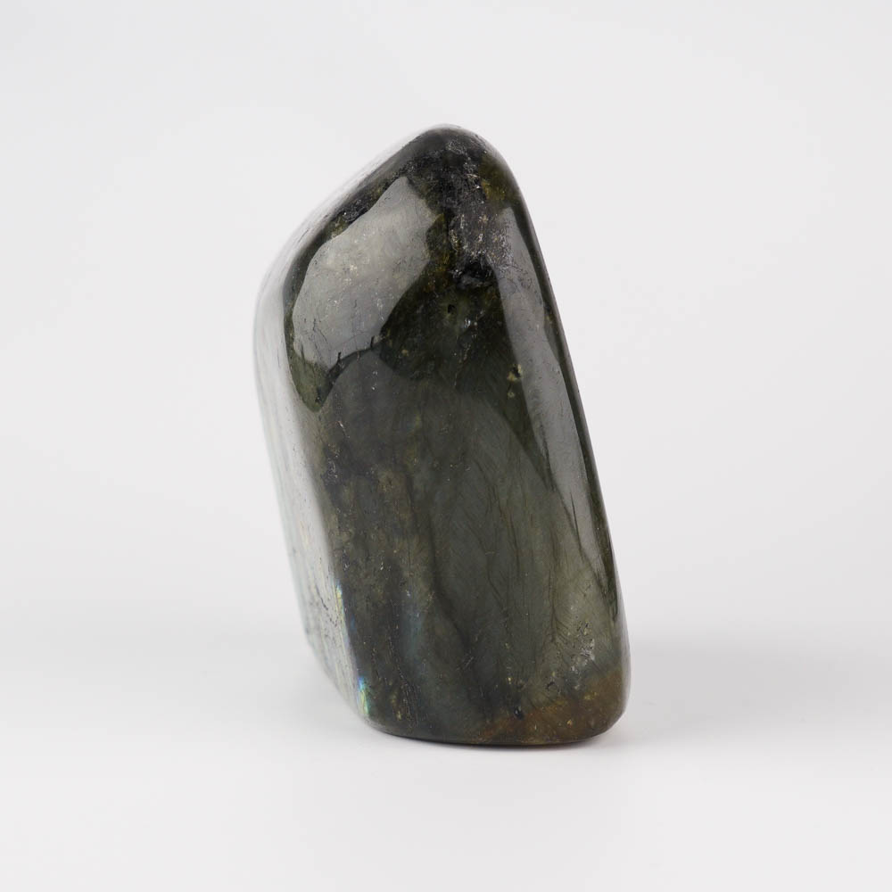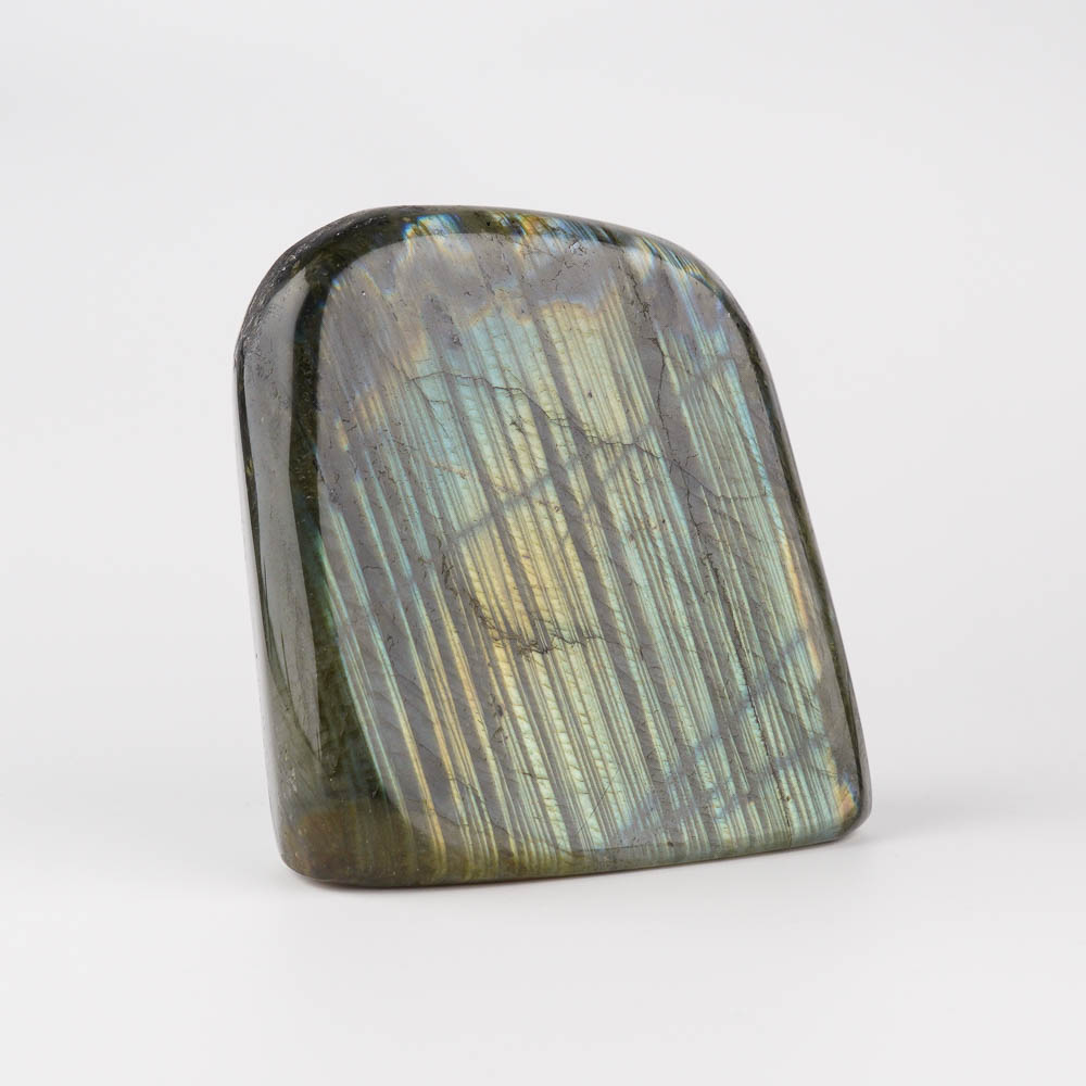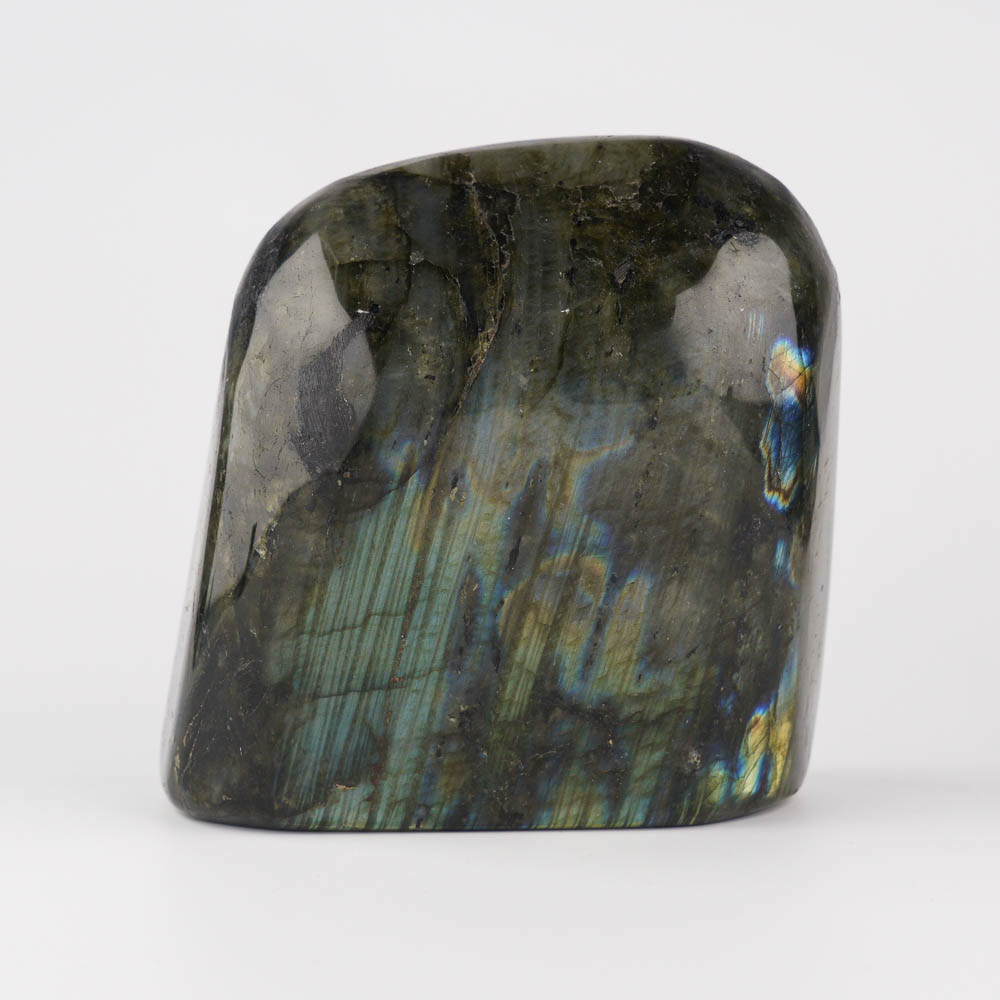 Ručne opracovaný, brúsený a leštený kameň labradorit z Madagaskaru, vhodný ako dekorácia. Typické odlesky sú vidieť len pri určitom uhle dopadu svetla a je ťažšie ich zachytiť na fotku.