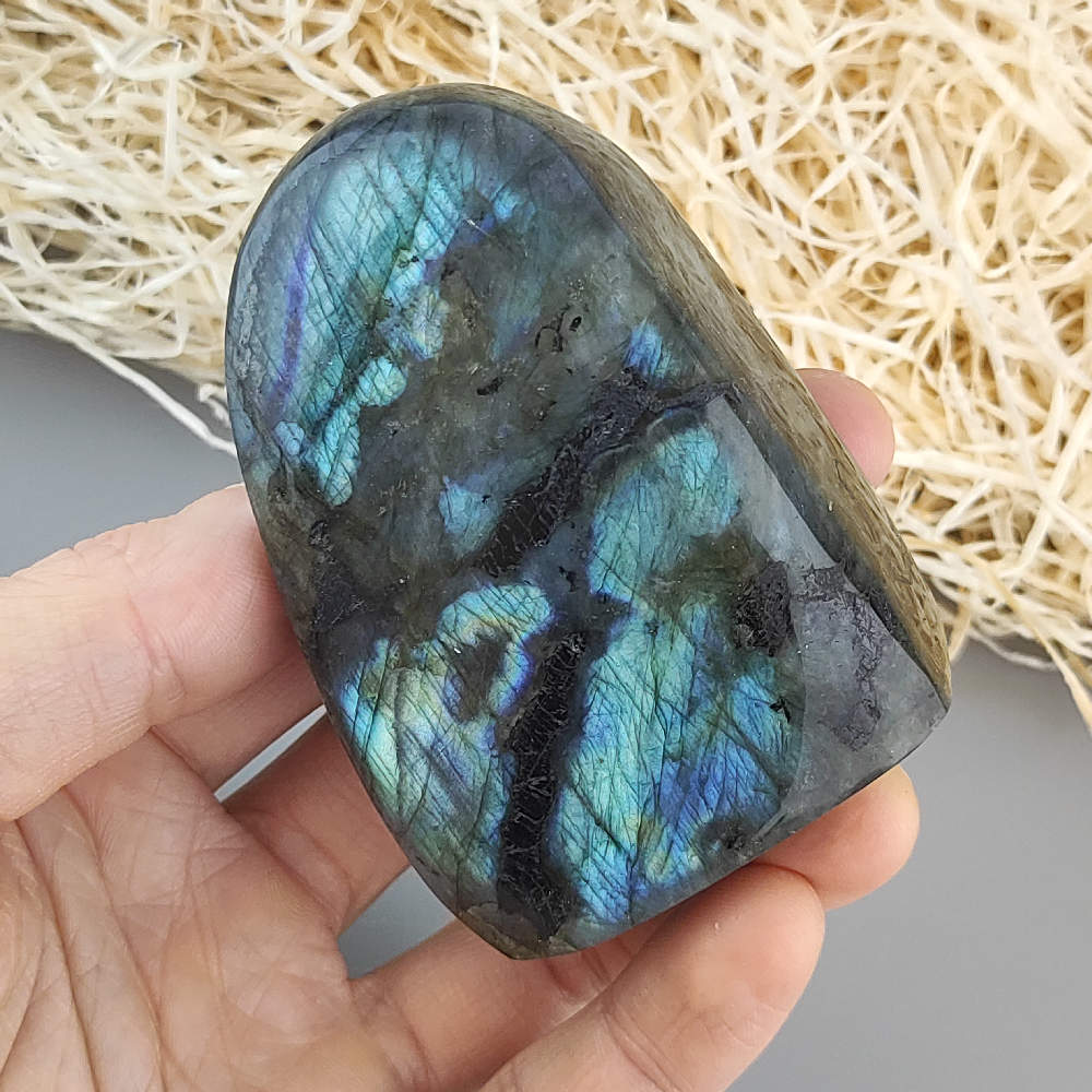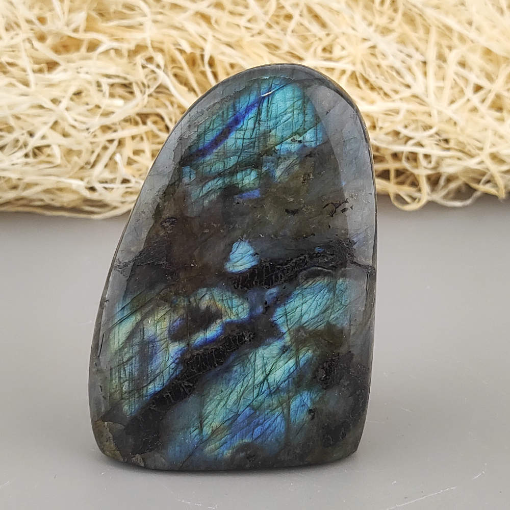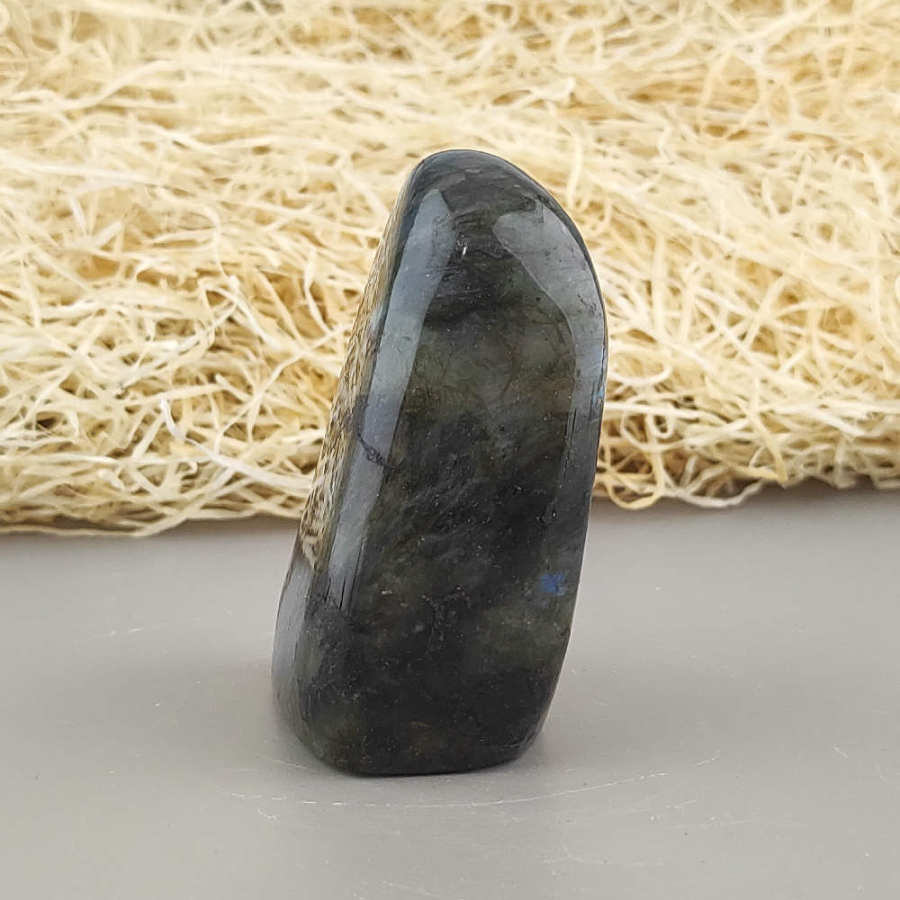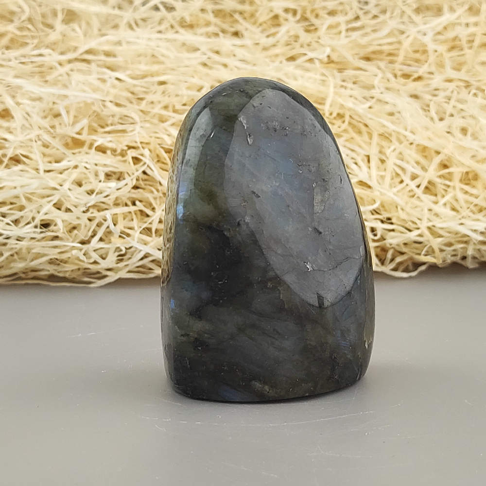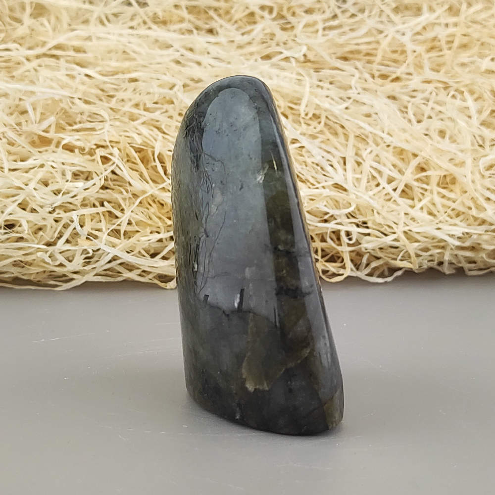 Ručne opracovaný, brúsený a leštený kameň labradorit z Madagaskaru, vhodný ako dekorácia. Typické odlesky sú vidieť len pri určitom uhle dopadu svetla a je ťažšie ich zachytiť na fotku.