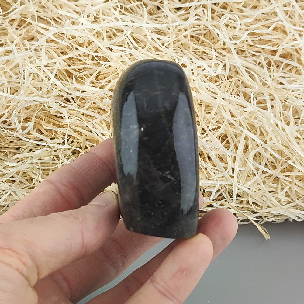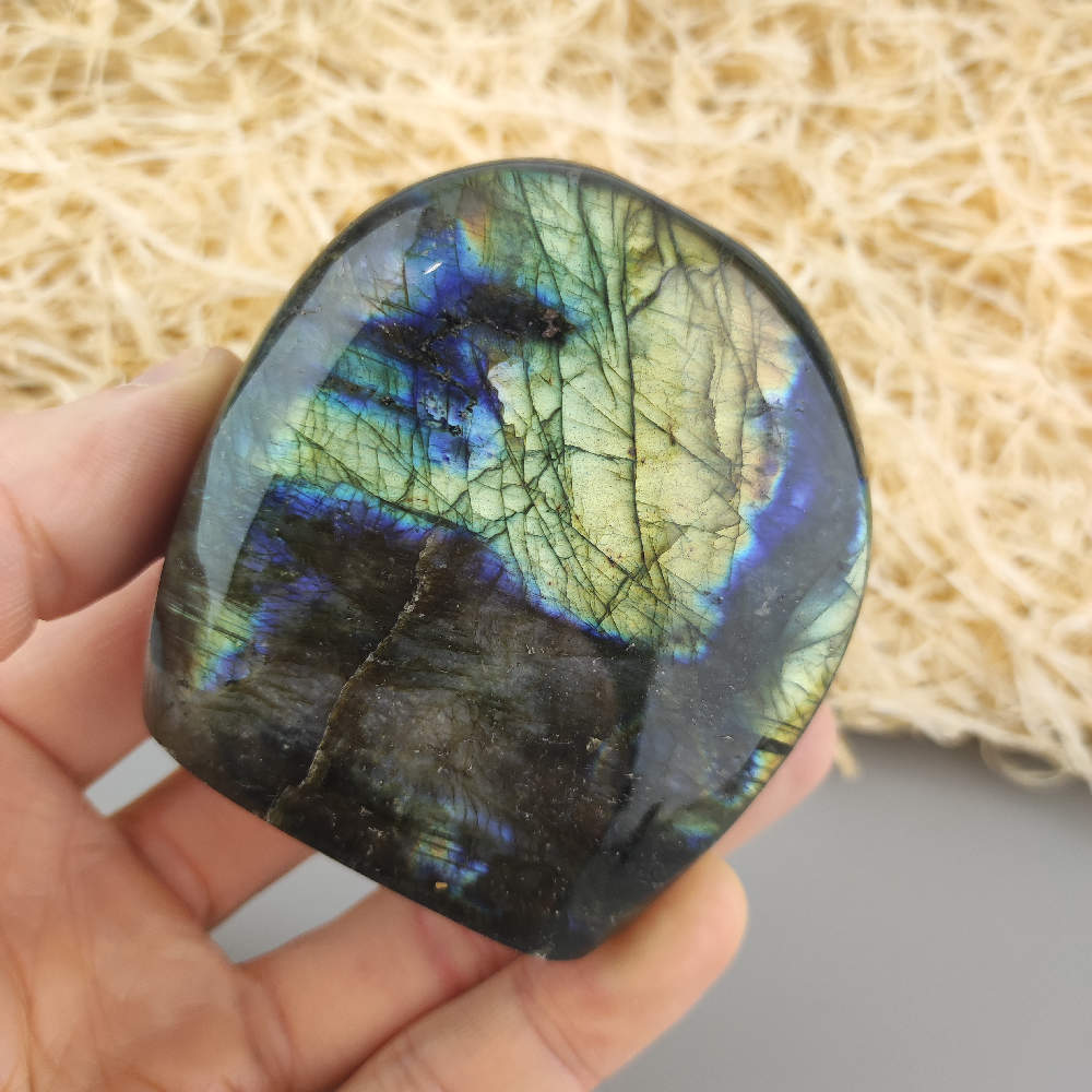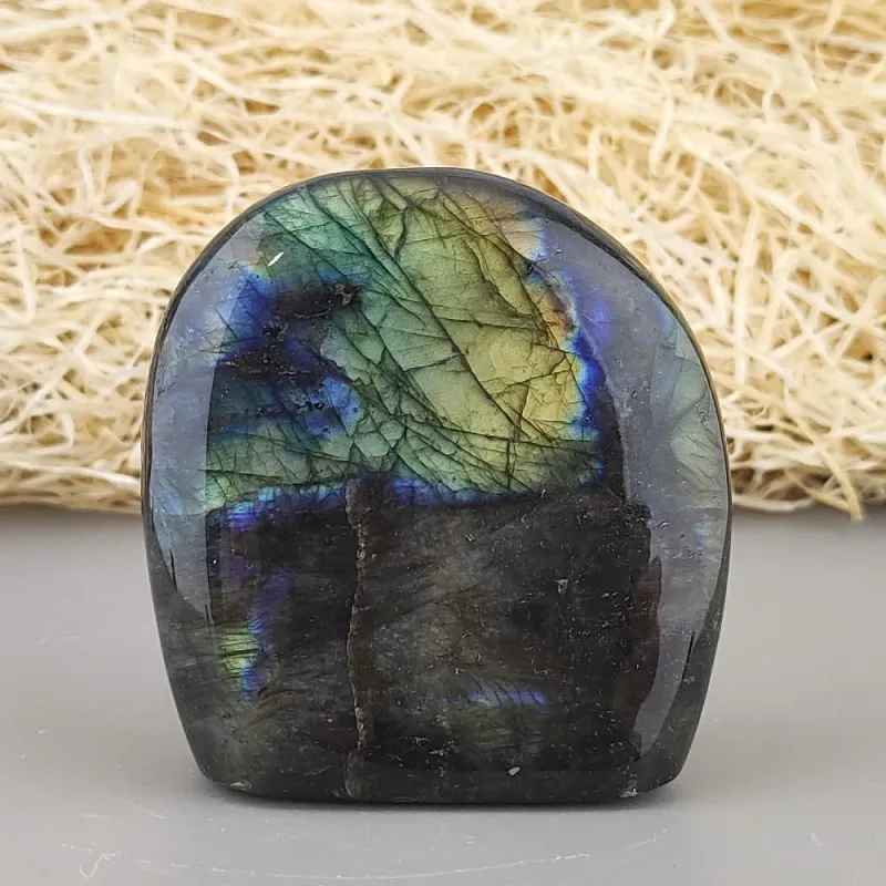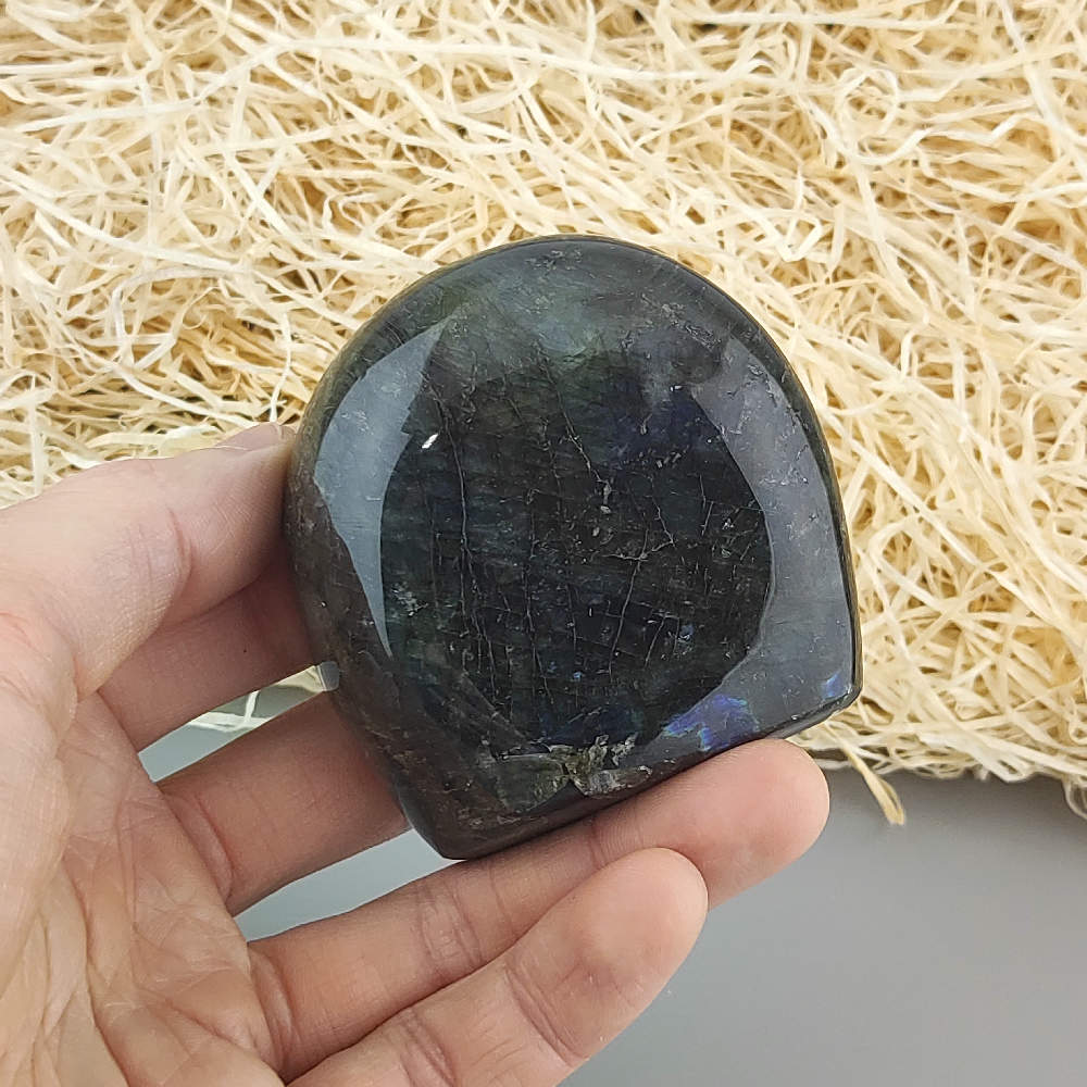 Ručne opracovaný, brúsený a leštený kameň labradorit z Madagaskaru, vhodný ako dekorácia. Typické odlesky sú vidieť len pri určitom uhle dopadu svetla a je ťažšie ich zachytiť na fotku.