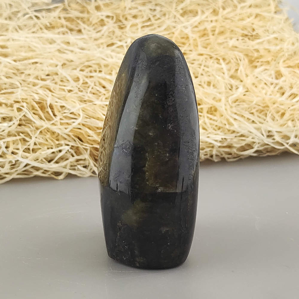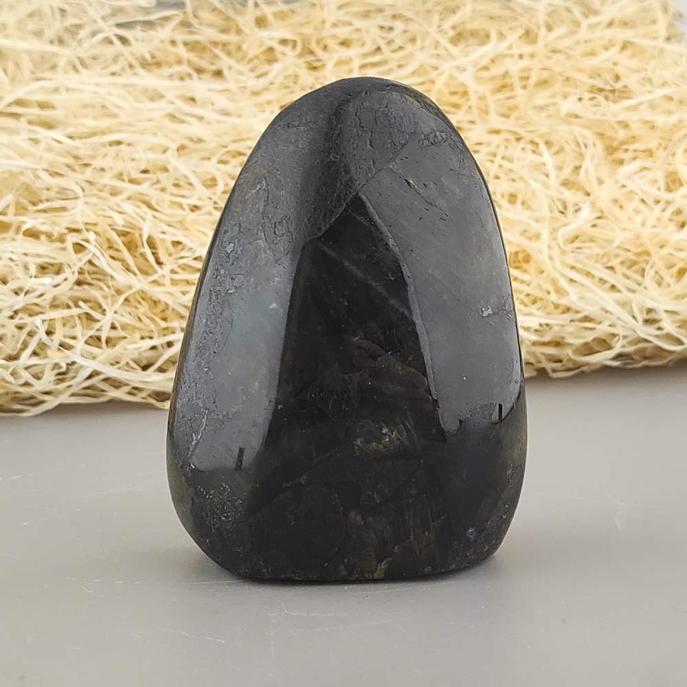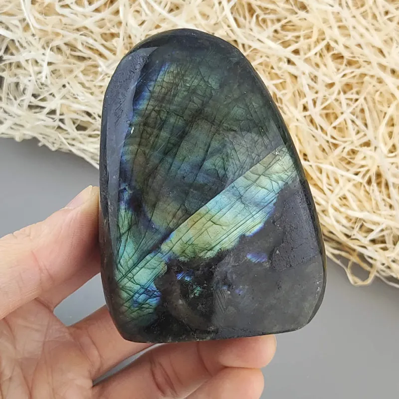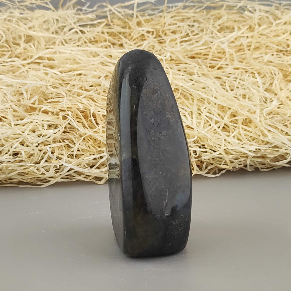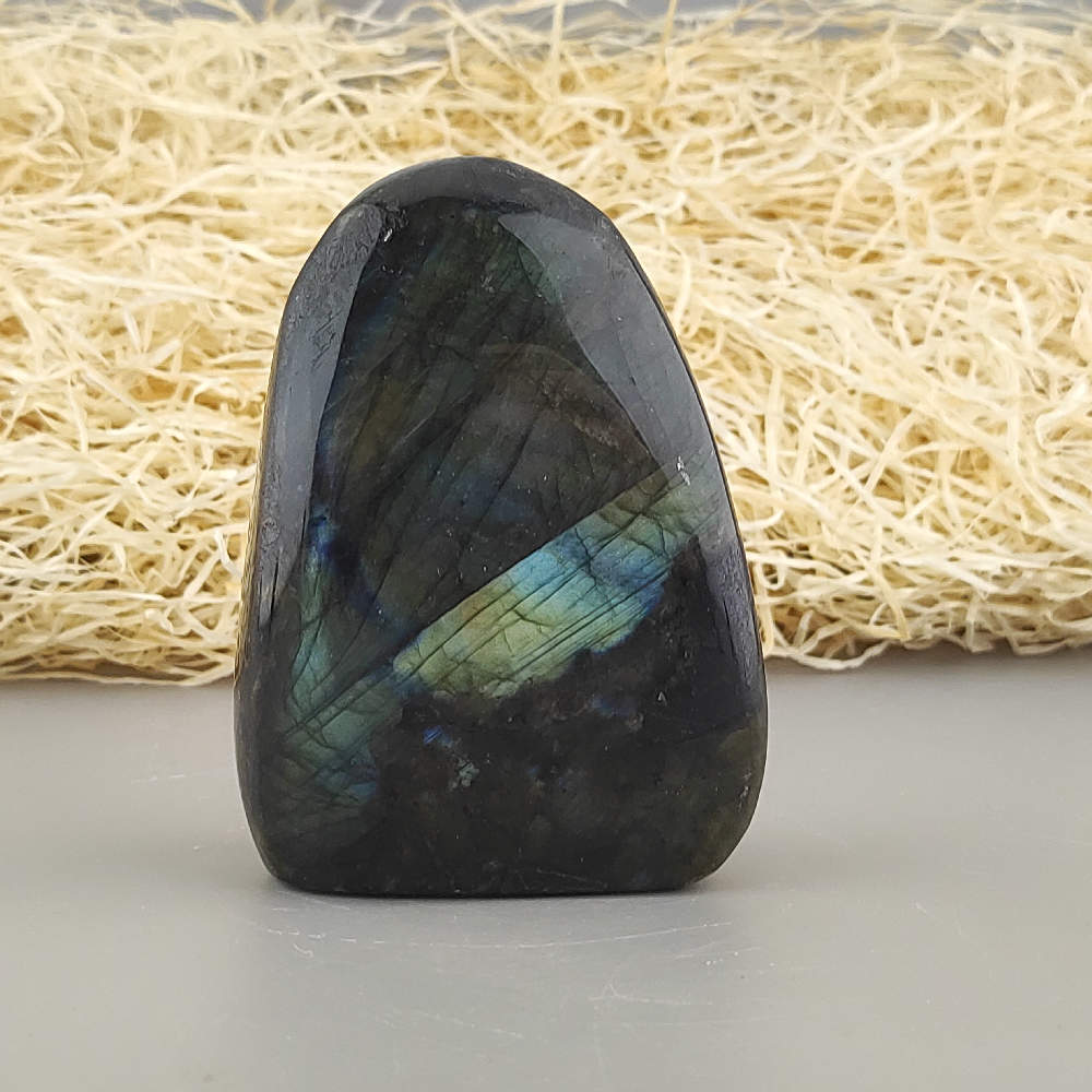 Ručne opracovaný, brúsený a leštený kameň labradorit z Madagaskaru, vhodný ako dekorácia. Typické odlesky sú vidieť len pri určitom uhle dopadu svetla a je ťažšie ich zachytiť na fotku.