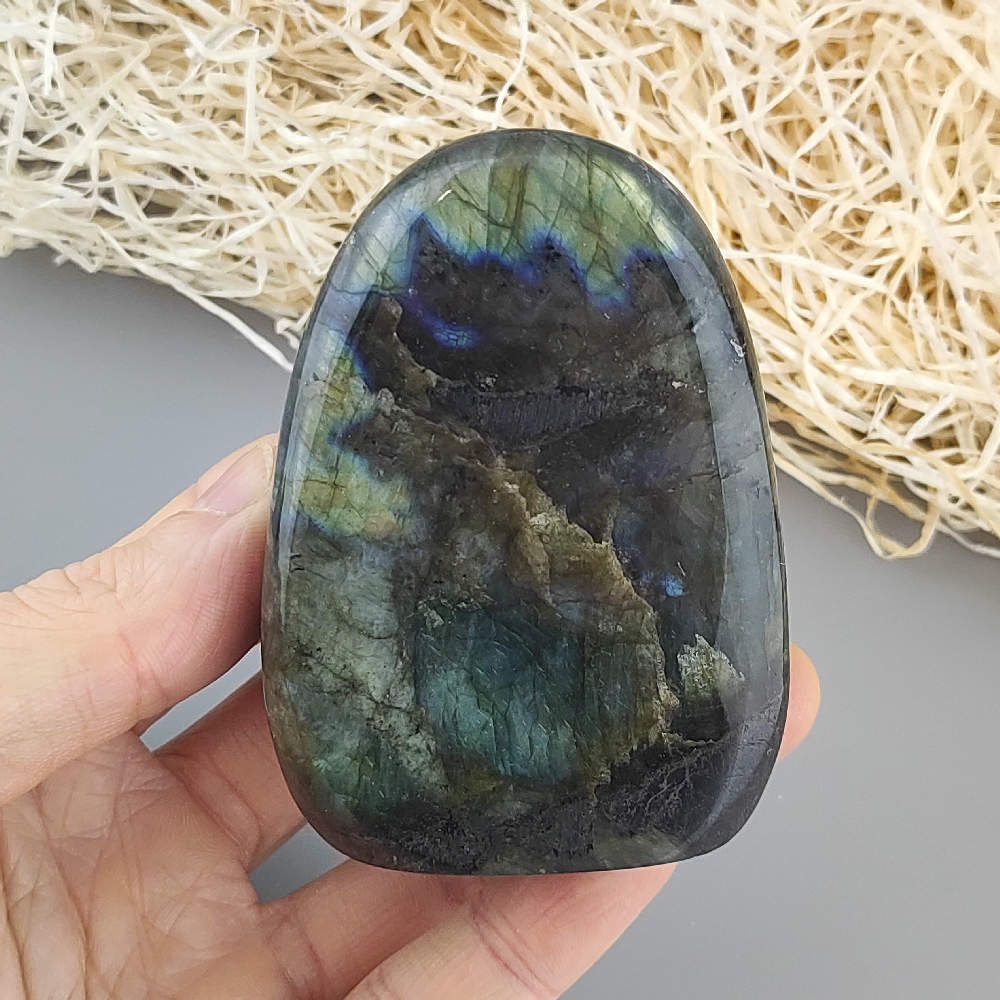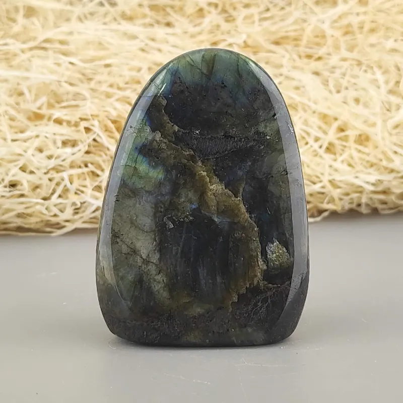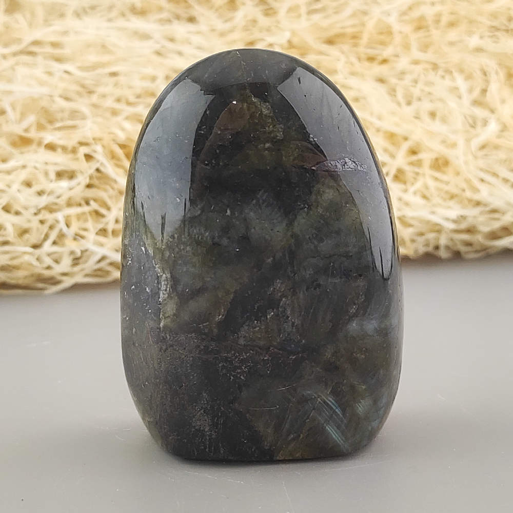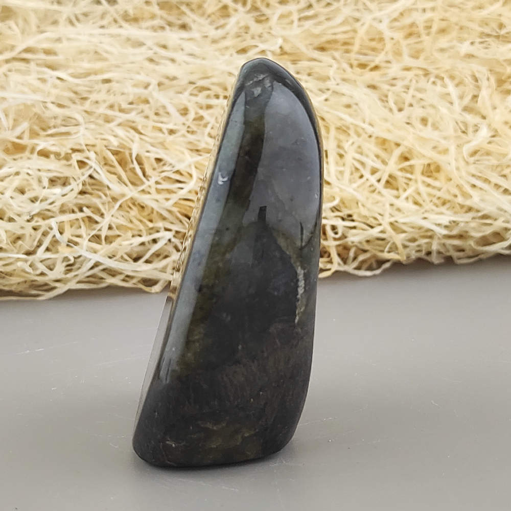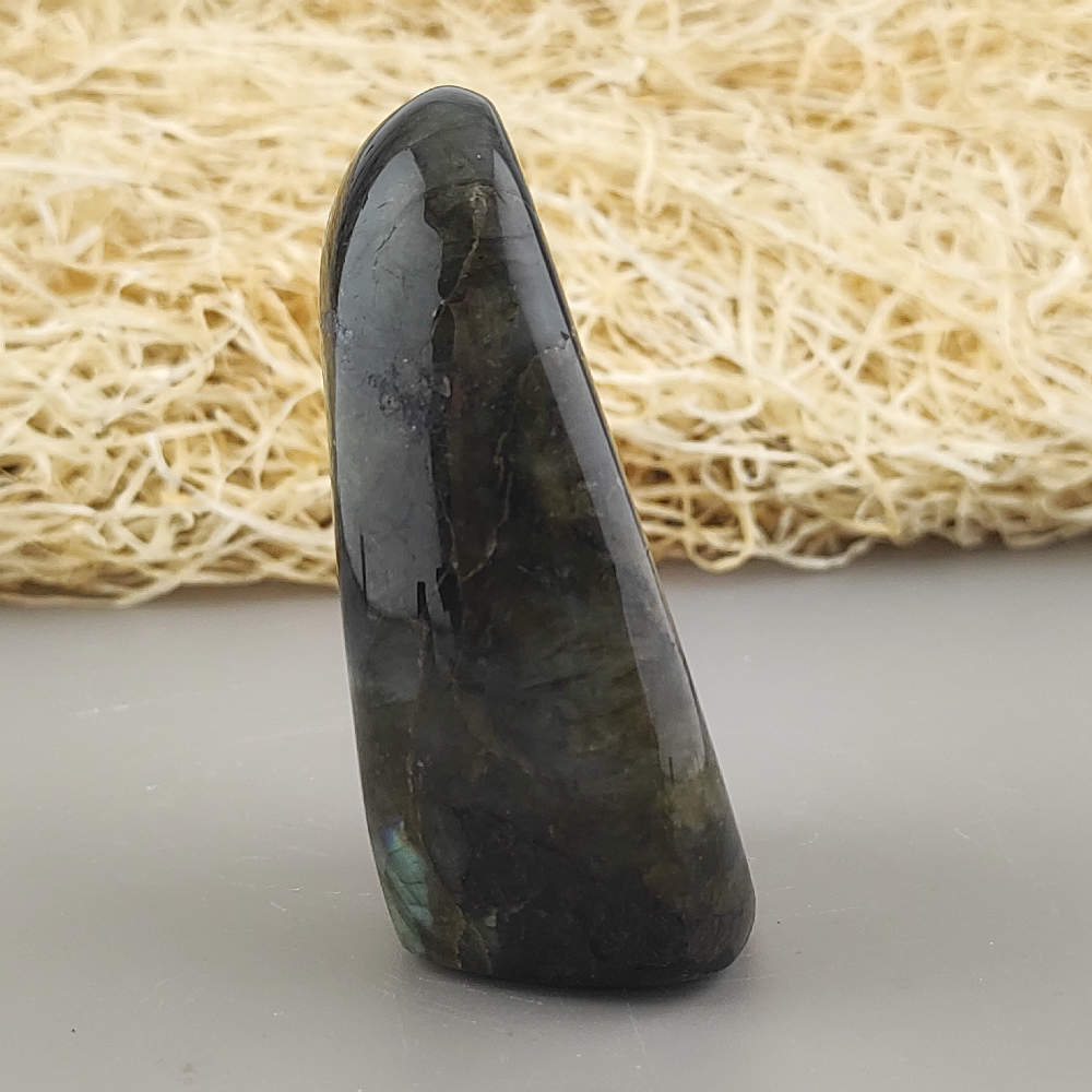 Ručne opracovaný, brúsený a leštený kameň labradorit z Madagaskaru, vhodný ako dekorácia. Typické odlesky sú vidieť len pri určitom uhle dopadu svetla a je ťažšie ich zachytiť na fotku.