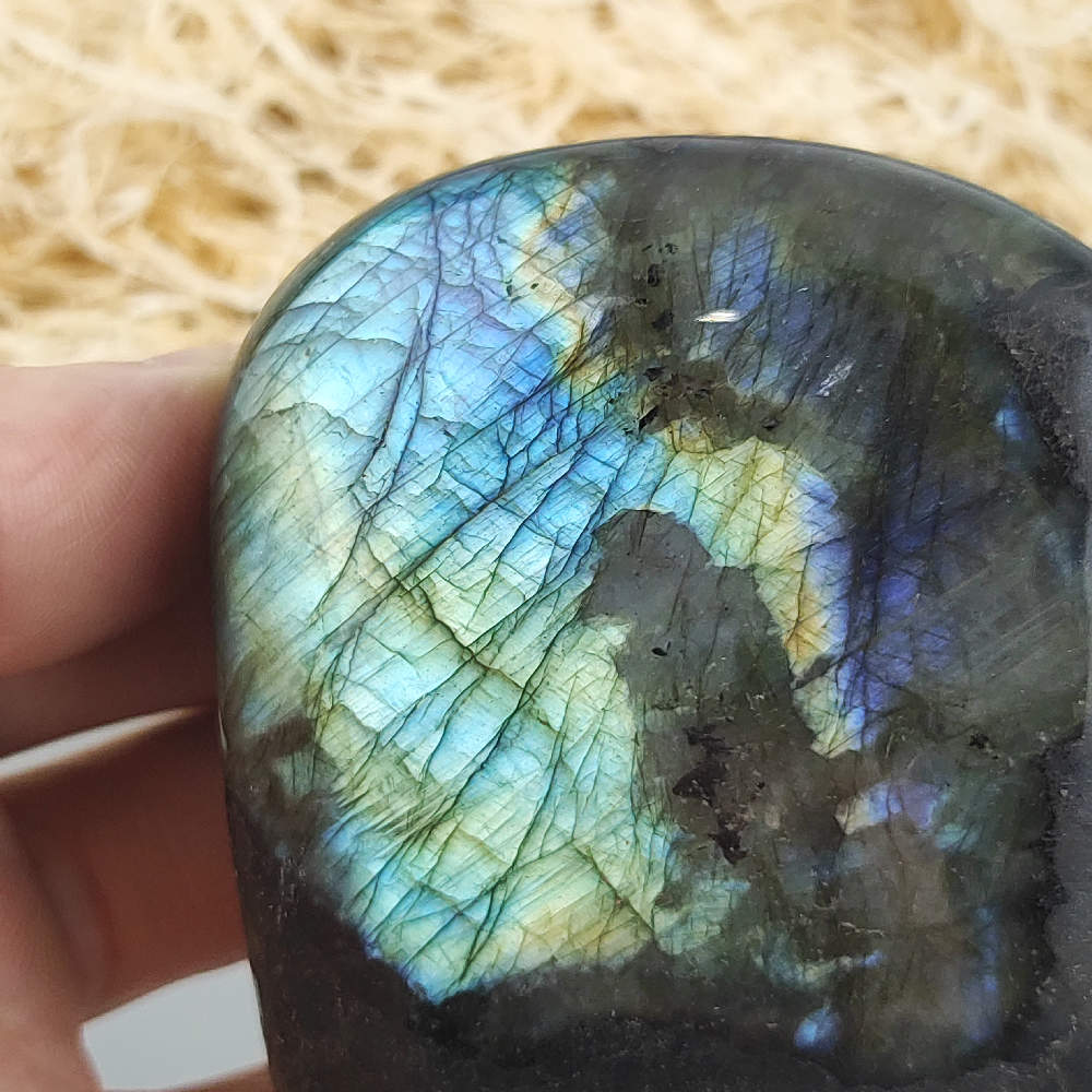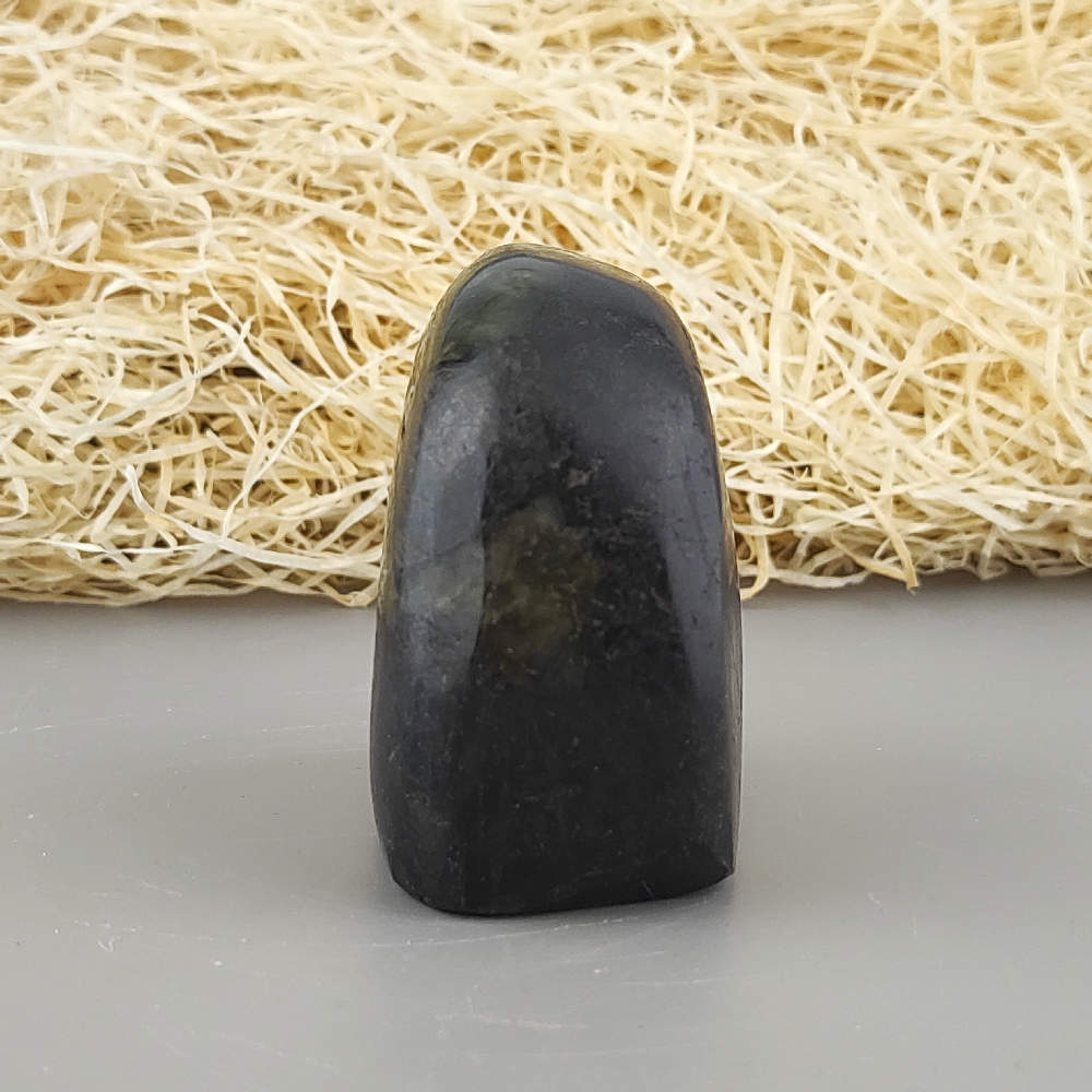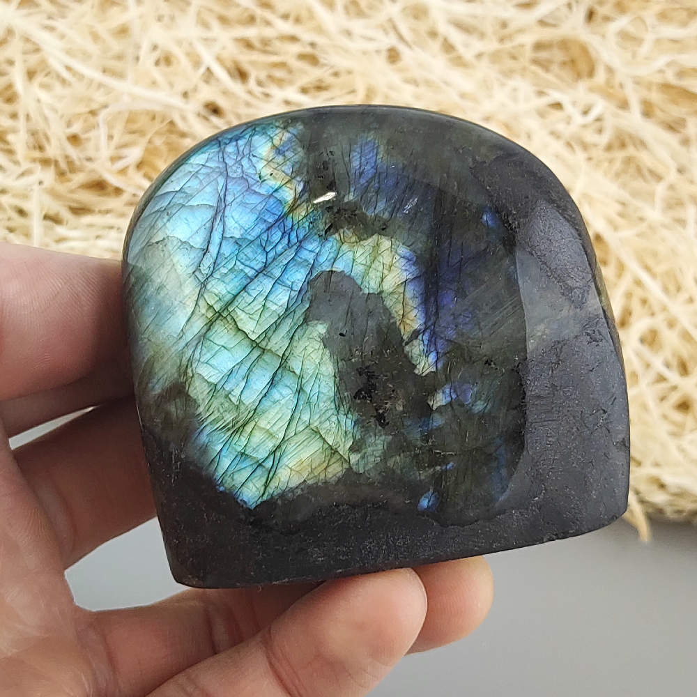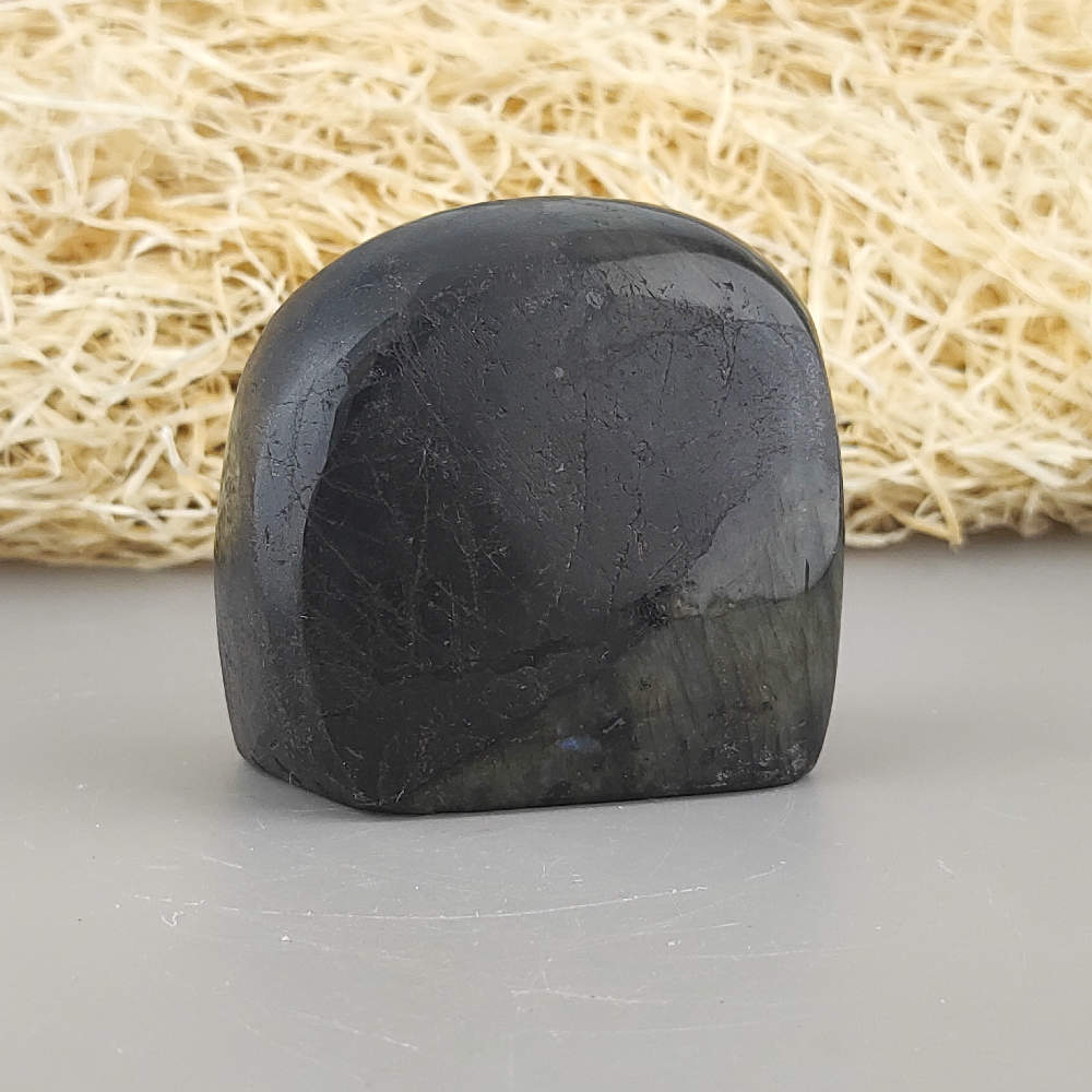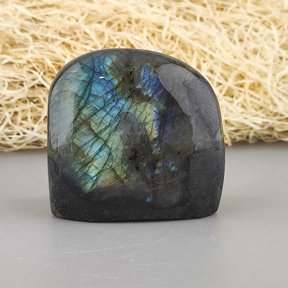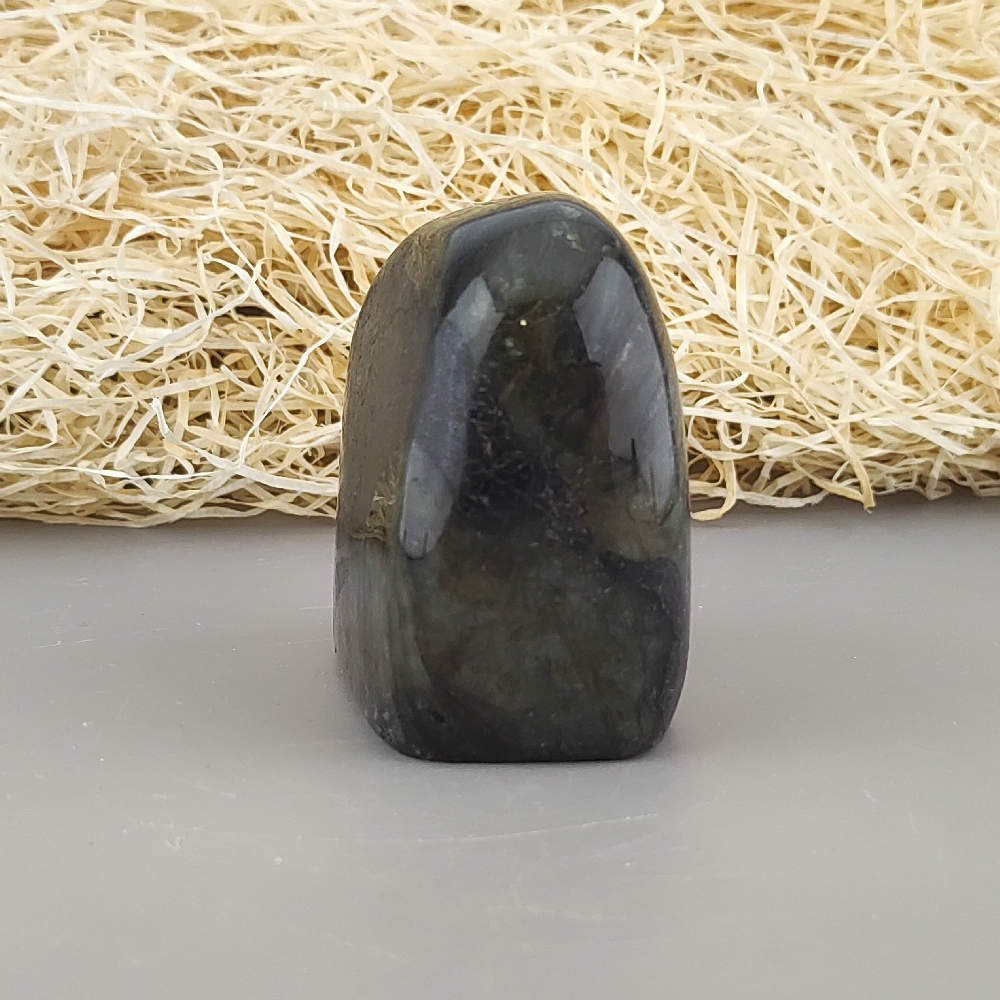 Ručne opracovaný, brúsený a leštený kameň labradorit z Madagaskaru, vhodný ako dekorácia. Typické odlesky sú vidieť len pri určitom uhle dopadu svetla a je ťažšie ich zachytiť na fotku.