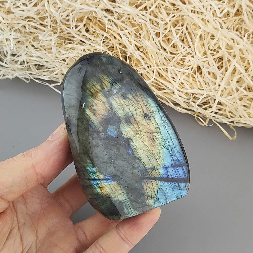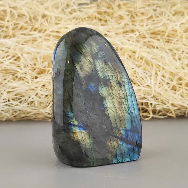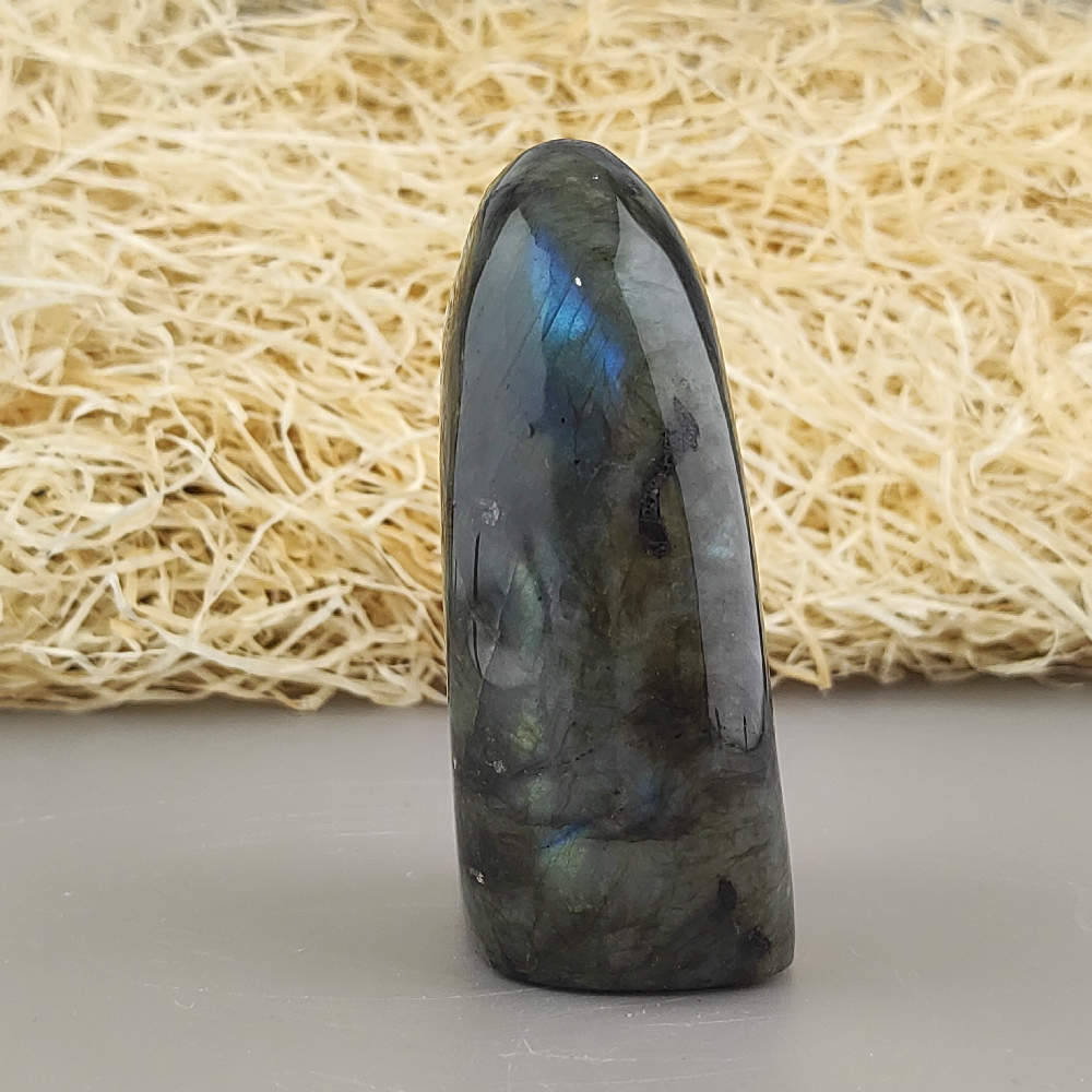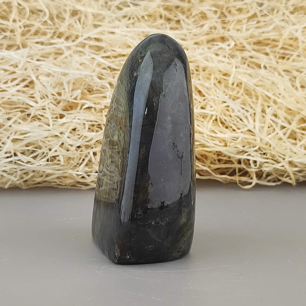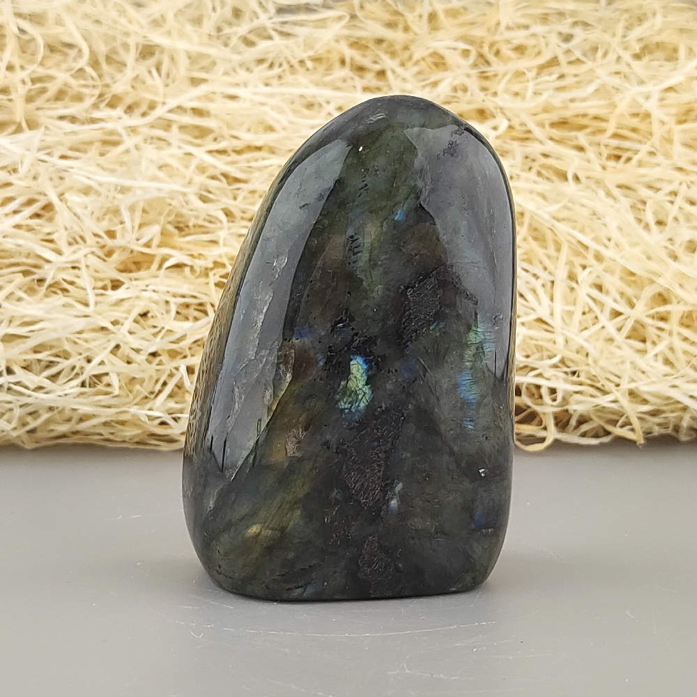Ručne opracovaný, brúsený a leštený kameň labradorit z Madagaskaru, vhodný ako dekorácia. Typické odlesky sú vidieť len pri určitom uhle dopadu svetla a je ťažšie ich zachytiť na fotku.