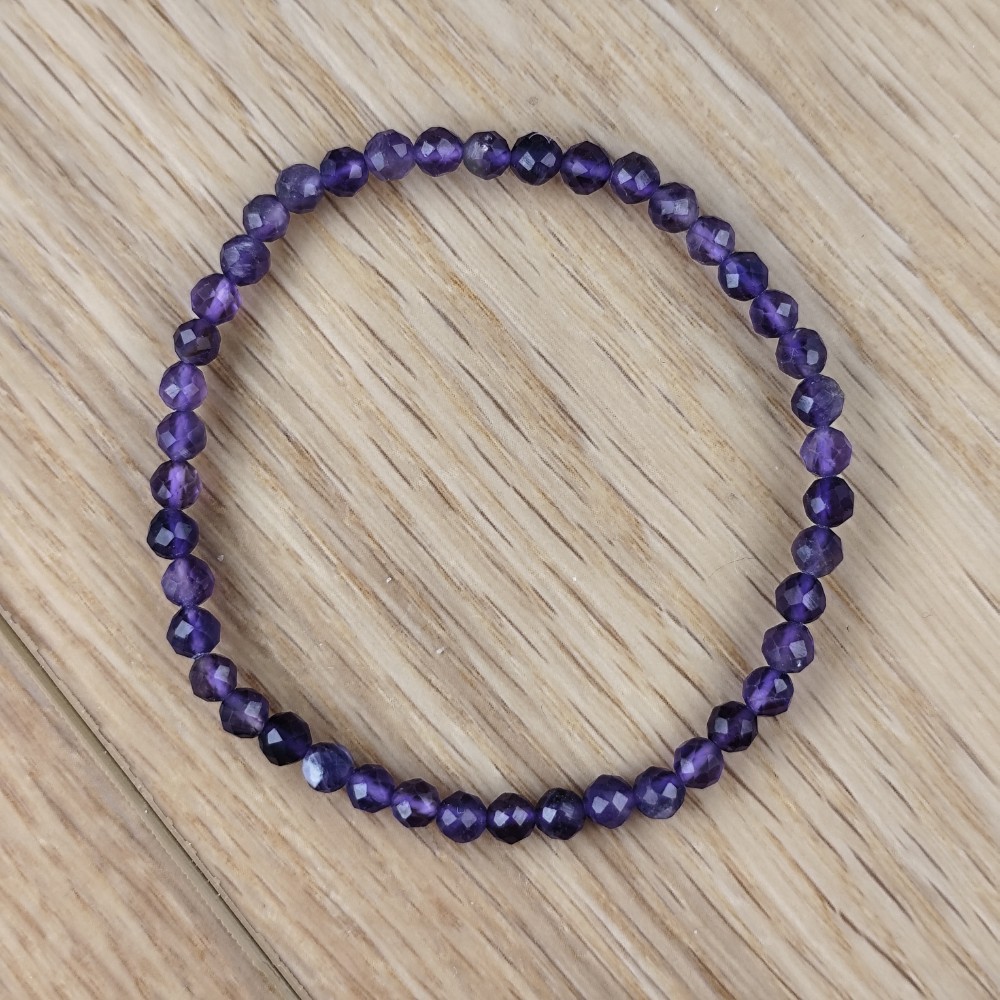 Náramok z drobných facetovaných guličiek, priemeru cca 4-5mm navlečených na pevnej gumičke. Vnútorný obvod náramku pri nenatiahnutej gumičke je cca 17cm. Vďaka drobným guličkám je náramok veľmi pohodlný na nosenie a nezavadzá ani pri písaní.