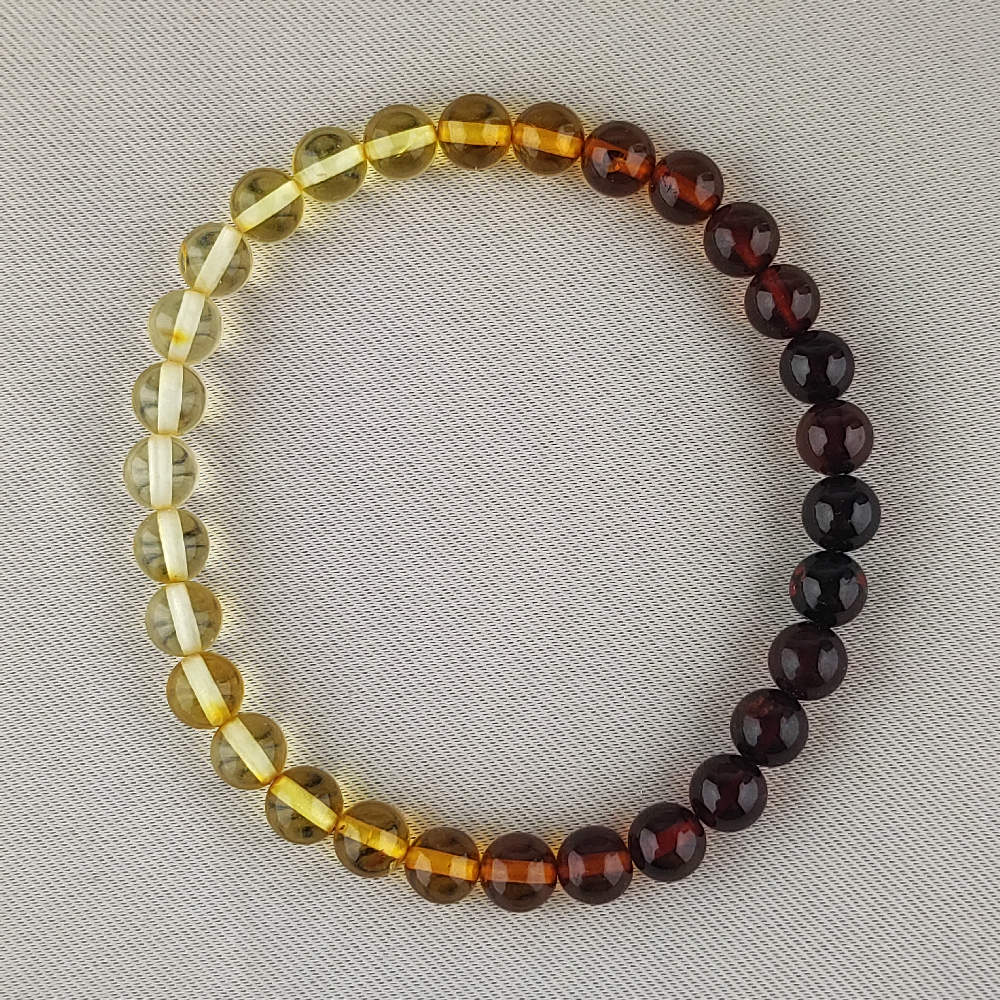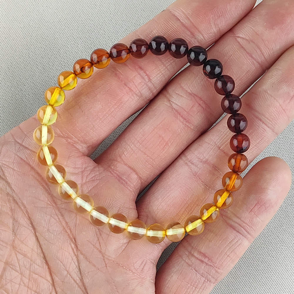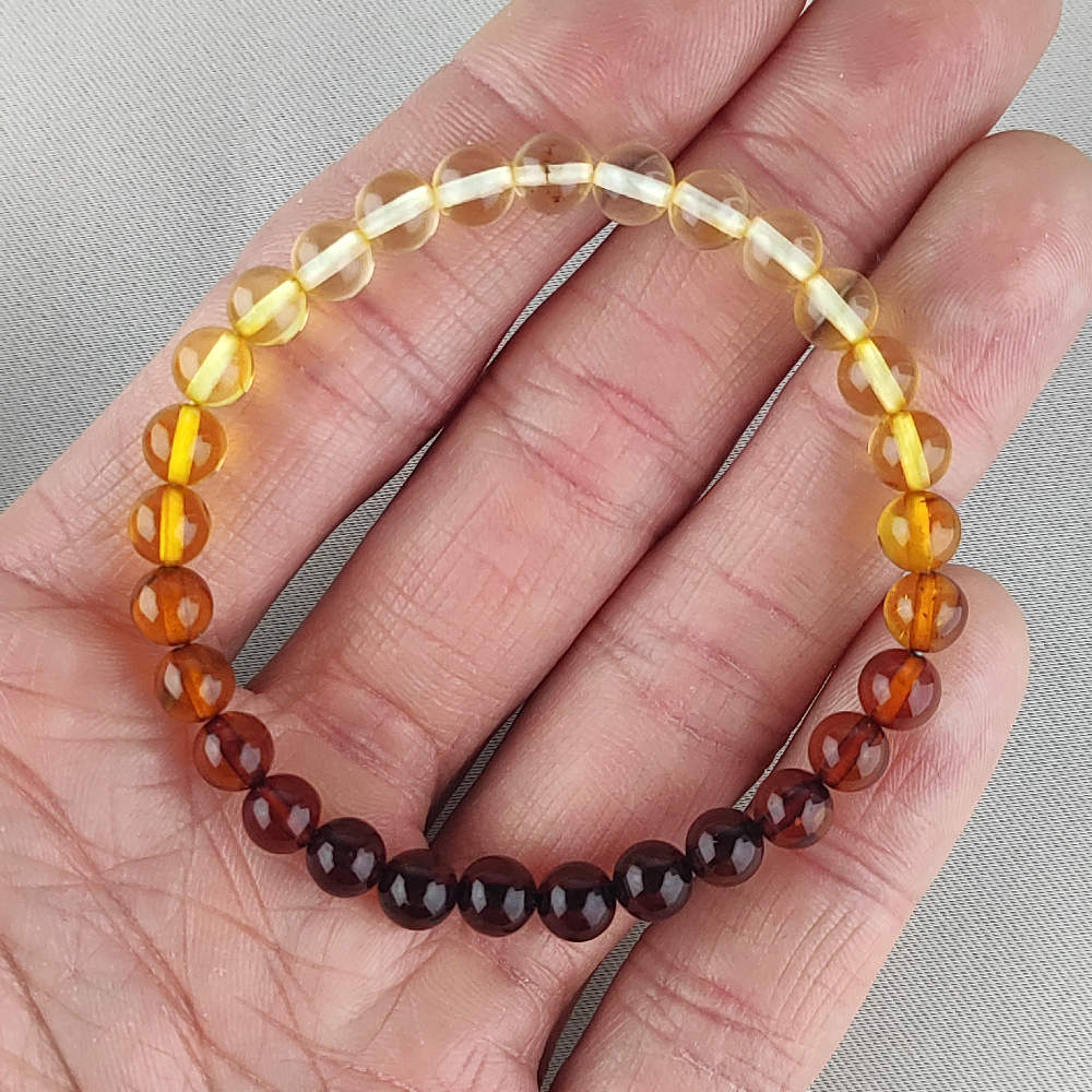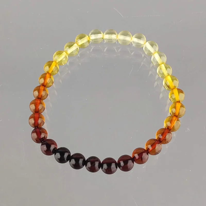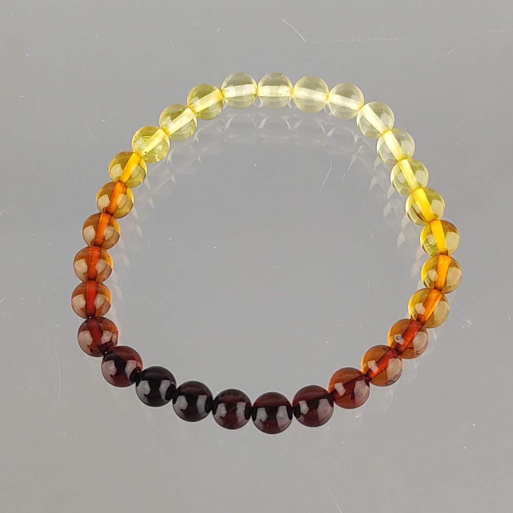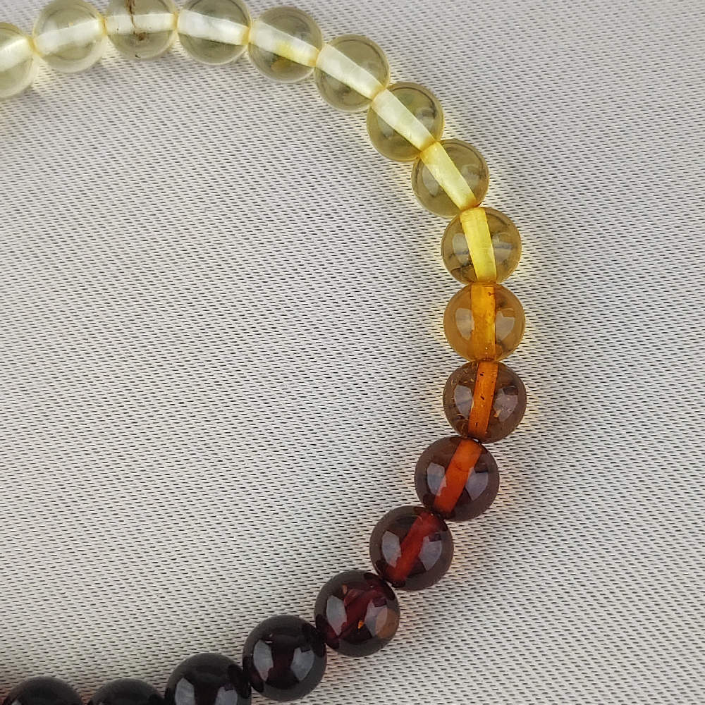 Náramok z guličiek jantáru na gumičke. Krásny farebný prechod od svetlej až po tmavú. Priemer guličky je cca 6mm Vnútorný obvod pri nenatiahnutej gumičke je cca 17,5cm.