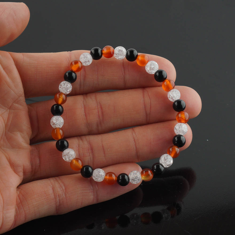 Náramok na gumičke z karneolu, ónyxu a pukaného krištáľu. Guličky majú priemer cca 6mm. Vnútorný obvod náramku pri nenatiahnutej gumičke je cca 17 - 18cm. Gumička sa teda vie prispôsobiť aj väčšej ruke.