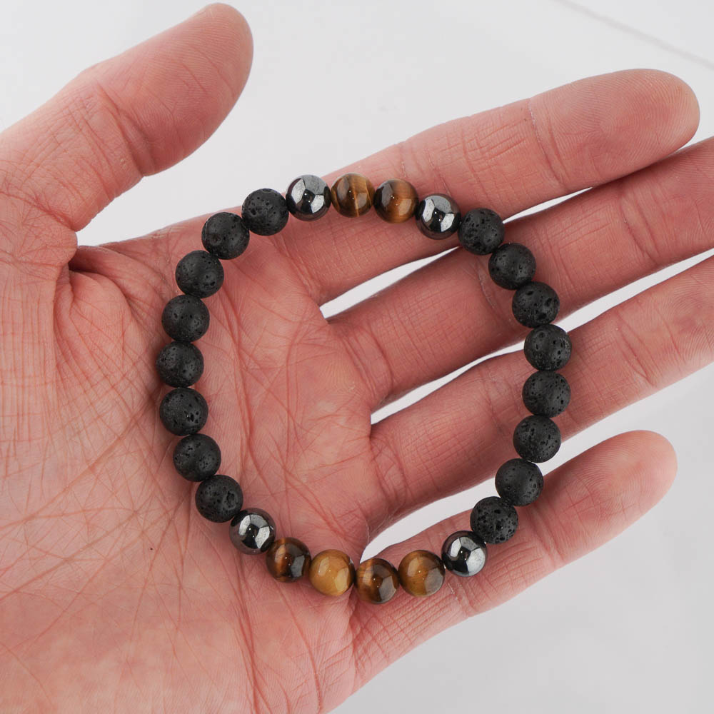 Náramok z guličiek lávového kameňa s hematitom a tigrím okom navlečené na pevnej gumičke.